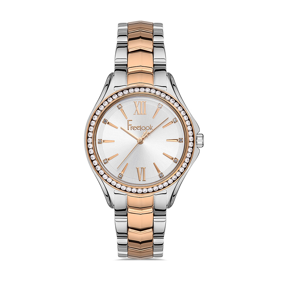 Carcasa rotunda din alama argintie, impreuna cu o bratara din otel inoxidabil in culori de auriu rose, adauga o nota de sofisticare care nu va trece neobservata. Rezistenta la apa de pana la 5 atm face din ceasul Freelook Lumiere alegerea ideala pentru activitati zilnice, fara grija deteriorarii.