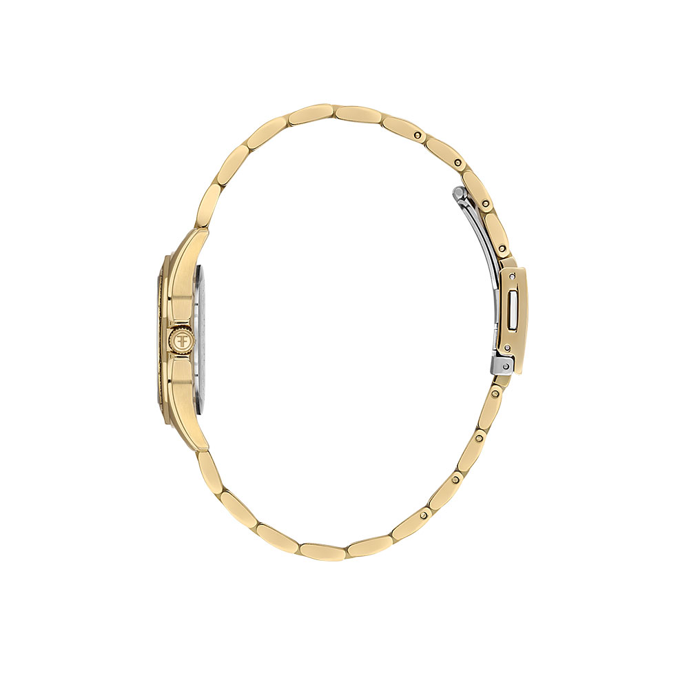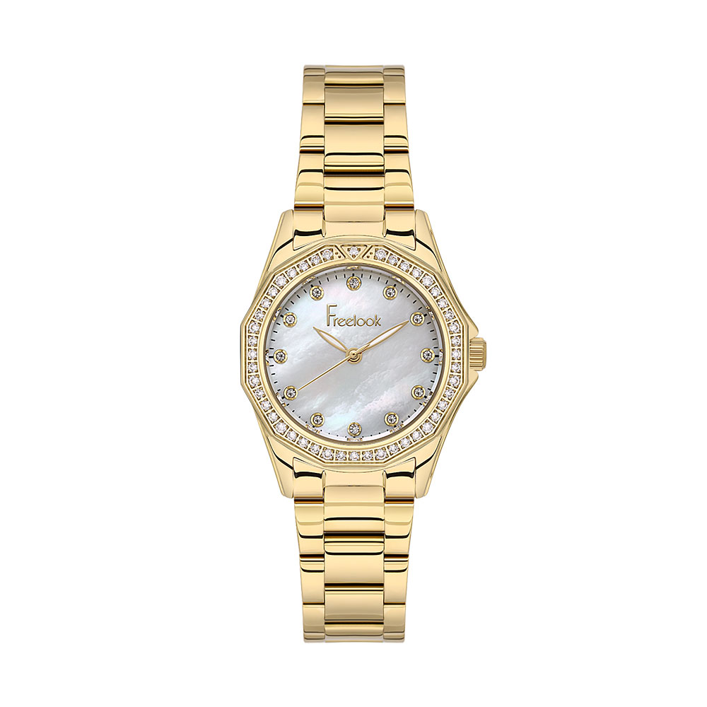 Acest ceas se distinge prin carcasa rotunda din otel inoxidabil cu finisaj auriu si bratara eleganta, tot din otel inoxidabil, care se inchide printr-un sistem fluture sofisticat. Cadranul in culoarea sidefului, protejat de un cristal mineral rezistent, este incrustat cu cristale delicate, adaugand un plus de stralucire si exclusivitate.