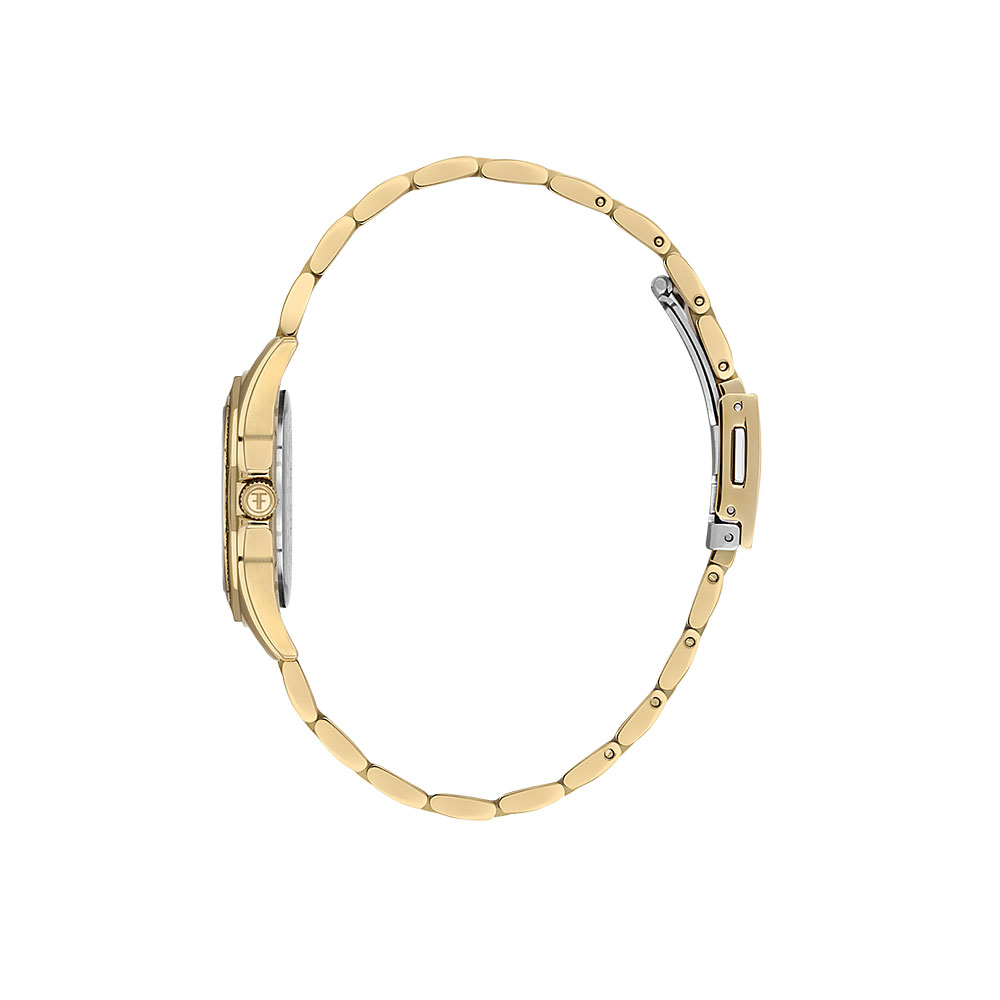 Rezistenta la apa de pana la 5 atm face acest ceas ideal pentru utilizare zilnica, indiferent de vreme, oferind protectie si durabilitate. Bratara din otel inoxidabil, finisata in aur, este completata de un sistem de inchidere tip fluture, care asigura o fixare sigura si confortabila pe incheietura mainii.