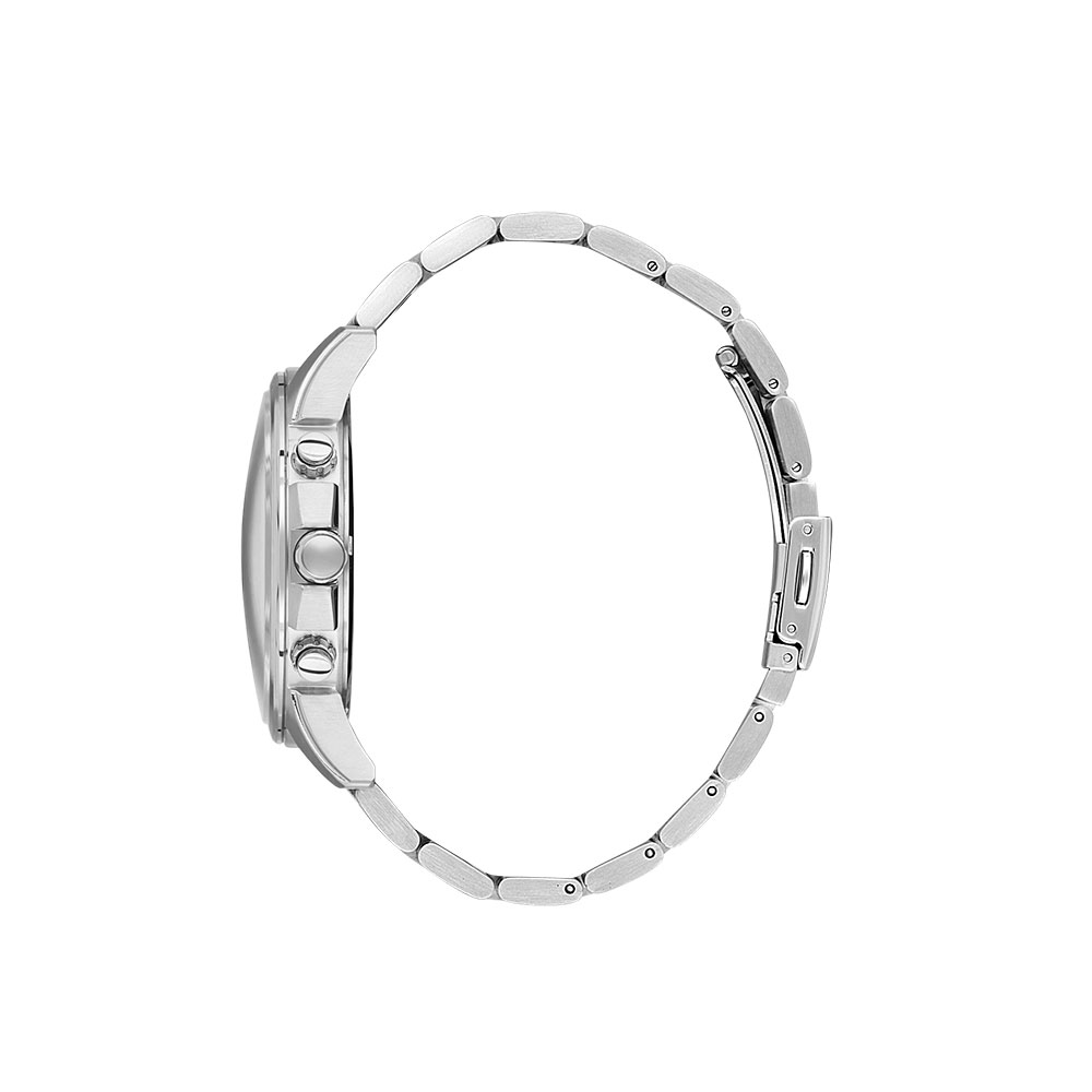 Construit din otel inoxidabil, atat carcasa cat si bratara sunt durabile si rezistente la uzura zilnica. Geamul din cristal mineral protejeaza afisajul analogic, asigurand claritate si rezistenta la zgarieturi. Carcasa rotunda, cu un diametru de 46 mm si grosime de 13 mm, se remarca printr-un profil masculin si impunator.
