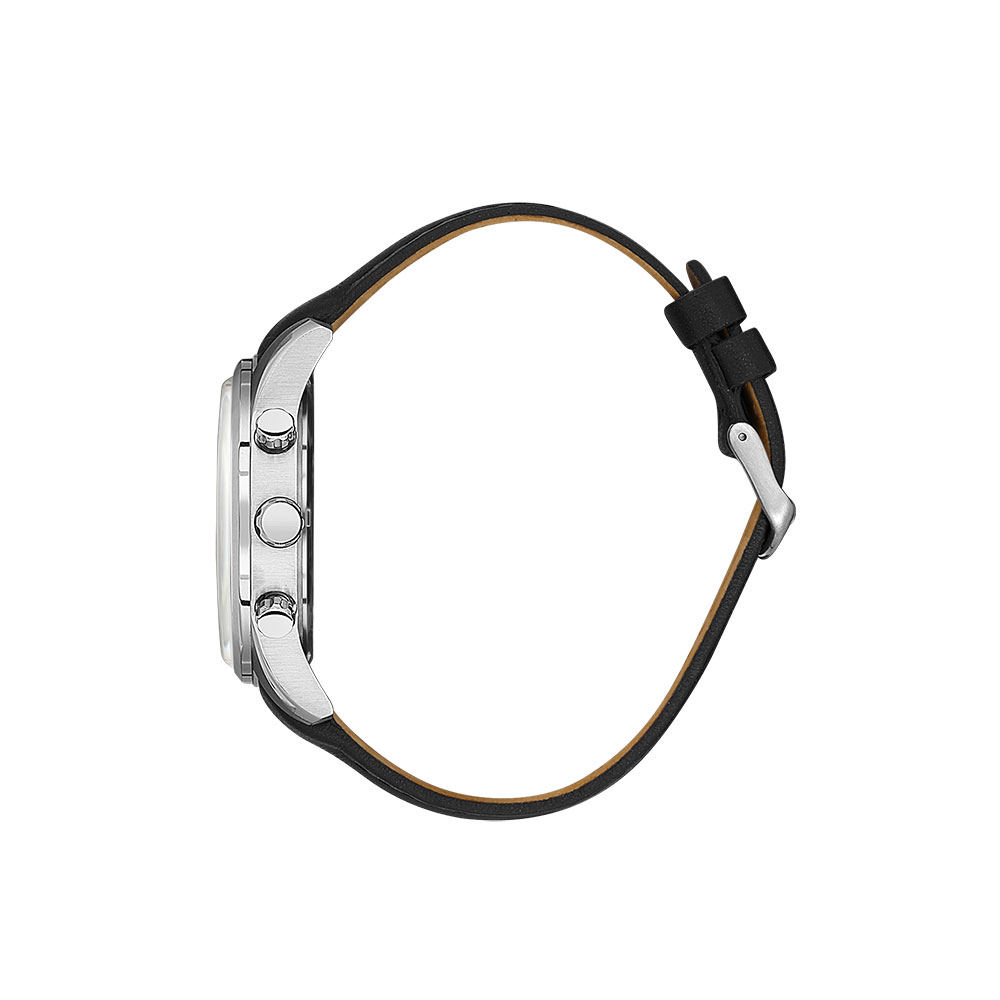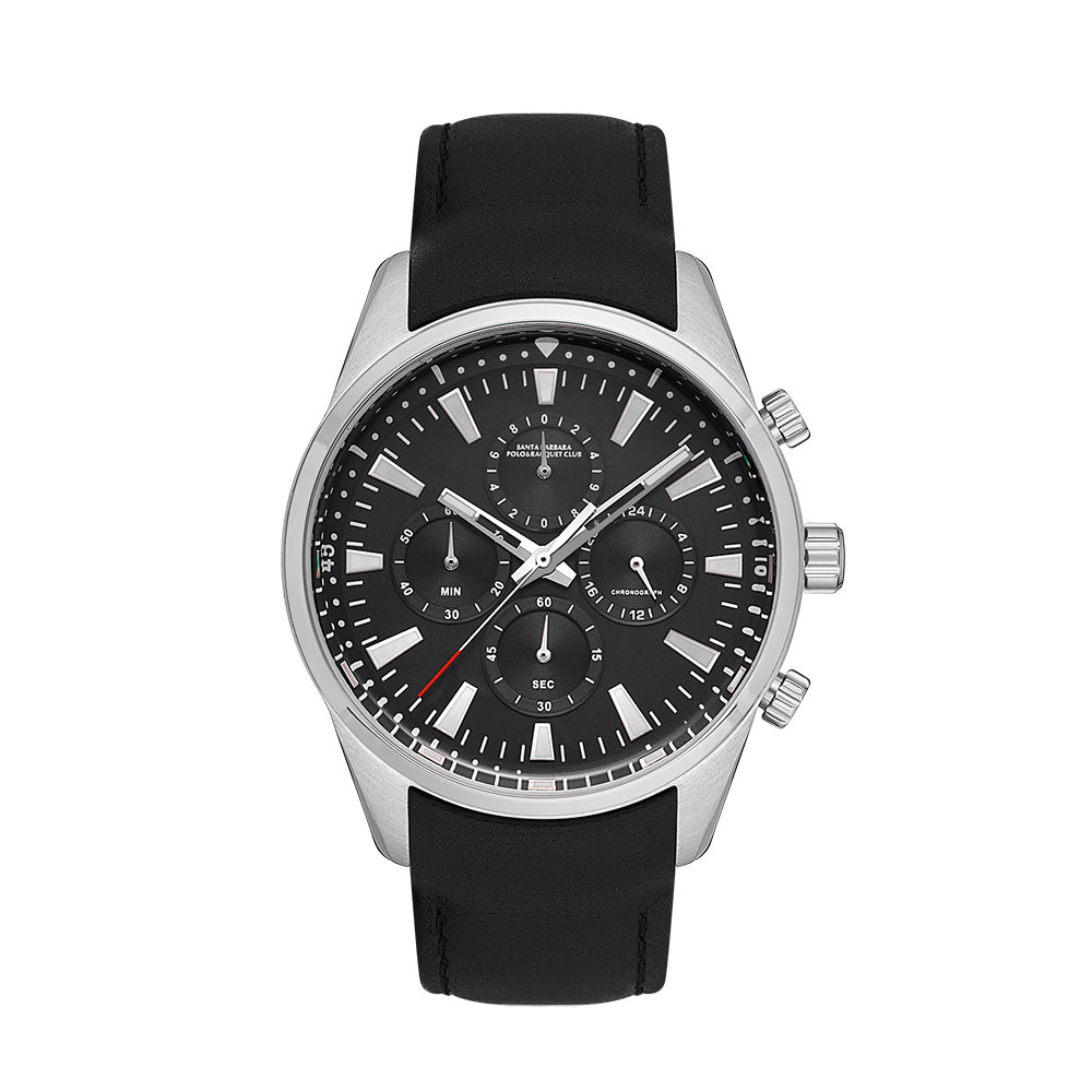 Carcasa rotunda, realizata din otel inoxidabil de inalta calitate, ofera un aspect robust si elegant, in timp ce cadranul negru adauga un plus de rafinament. Indicatorii si marcajele argintii creeaza un contrast placut, asigurand o lizibilitate excelenta. Cele trei subcadrane functionale completeaza estetica moderna si ofera functii utile pentru utilizatorii activi.