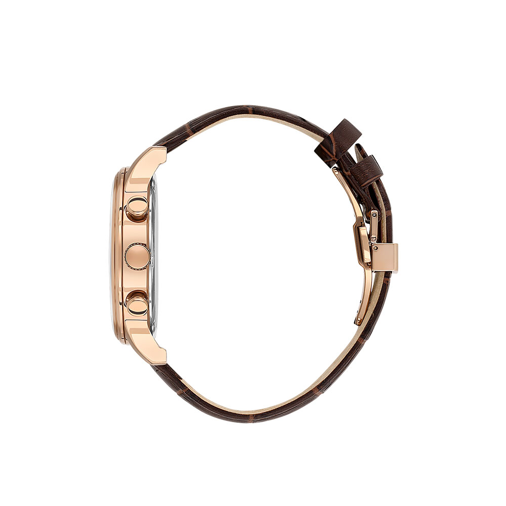 Cureaua din piele cafenie adauga un plus de confort si stil, avand un sistem de inchidere cu catarama care asigura o fixare sigura pe incheietura. Dimensiunile generoase ale carcasei de 45 mm si grosimea de 12 mm ofera un aspect robust si elegant, perfect pentru barbatul modern.