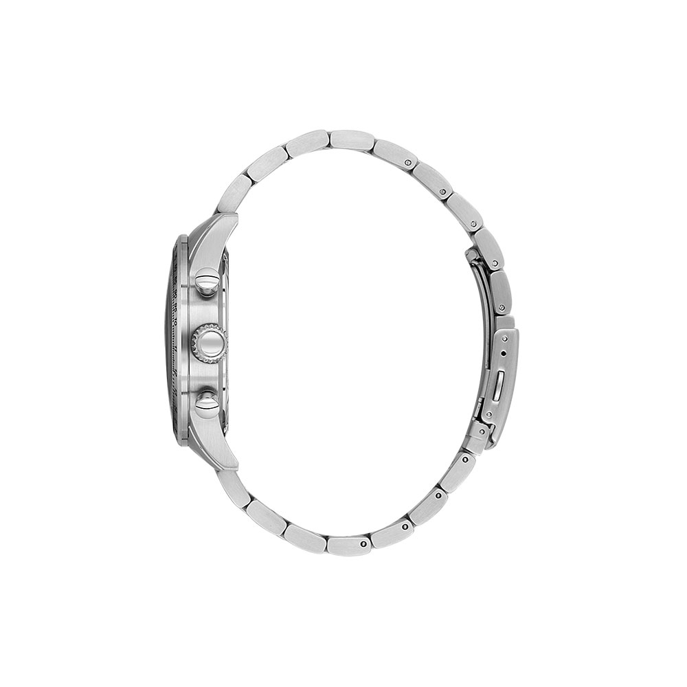 Carcasa rotunda din otel inoxidabil argintiu, cu un diametru de 44 mm si grosime de 13 mm, ofera un aspect impunator si masculin. Cadranul antracit adauga profunzime vizuala si contrasteaza subtil cu indicatoarele si subcadranele cronografului, evidentiind functionalitatea si detaliile tehnice.