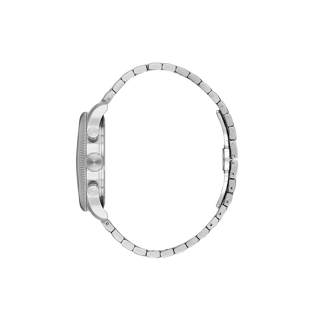 Carcasa rotunda din otel inoxidabil argintiu de 42 mm este completata de un cadran negru cu afisaj analogic, ce ofera o vizibilitate excelenta si un contrast placut. Cifrele luminescente si detaliile subtile adauga o nota moderna, in timp ce bratara metalica robusta cu inchidere tip fluture asigura confort si siguranta la purtare.
