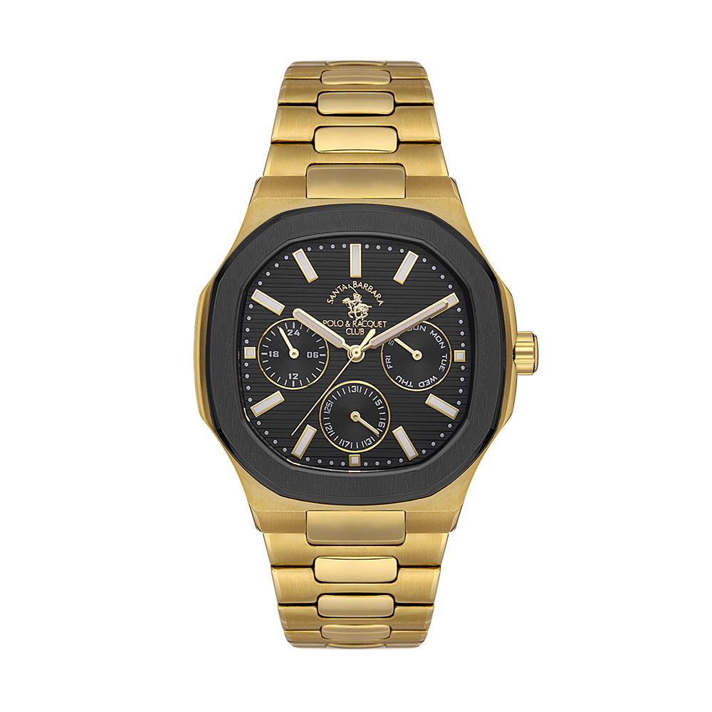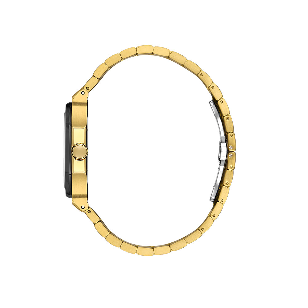 Carcasa octogonala din otel inoxidabil auriu ofera un design robust si elegant, in timp ce cadranul negru texturat este completat de marcaje si indicatoare aurii pentru o vizibilitate excelenta. Geamul din cristal mineral asigura rezistenta la zgarieturi, protejand mecanismul japonez Quartz Epson Vx7je1, cunoscut pentru precizia sa.