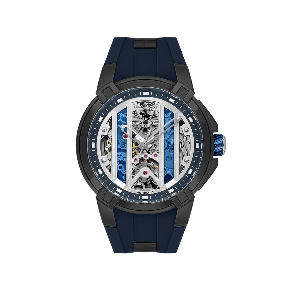 Designul skeleton al cadranului ofera o privire captivanta asupra mecanismului interior, adaugand un plus de rafinament si originalitate. Combinatia de culori – negru, bleumarin, argintiu si albastru metalizat – transforma acest ceas intr-un accesoriu statement, usor de asortat si remarcabil prin stil.