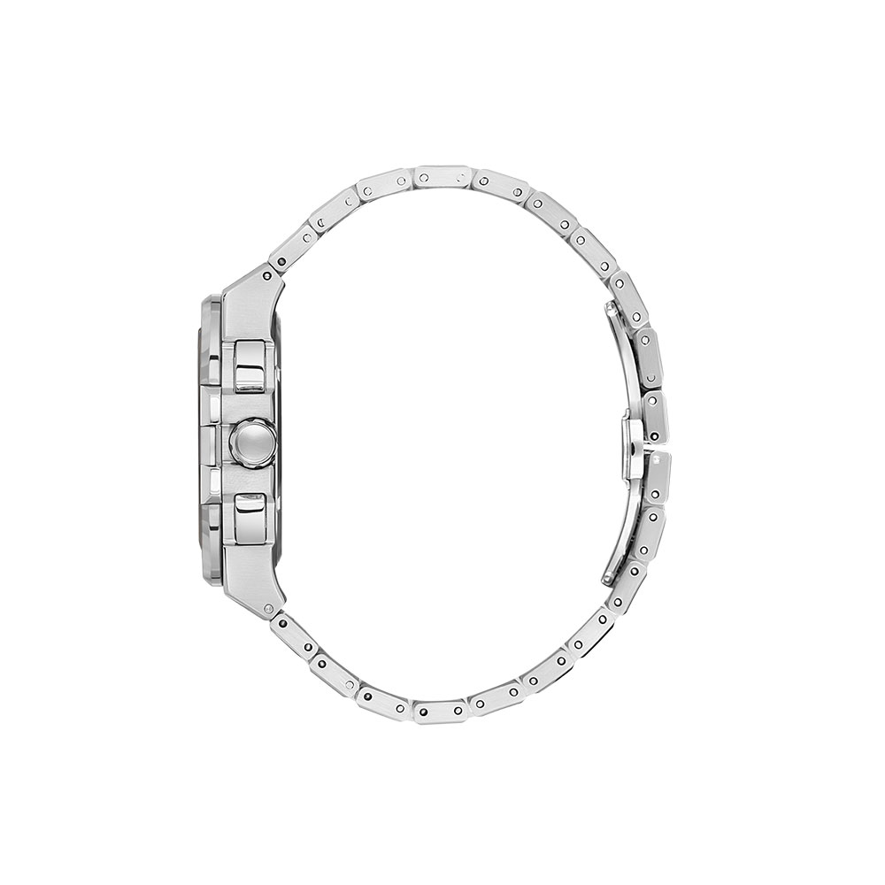 Carcasa rotunda din otel inoxidabil argintiu, cu diametrul de 44 mm si grosimea de 12 mm, gazduieste un cadran bleumarin expresiv, protejat de un cristal mineral rezistent la zgarieturi. Bratara metalica argintie, cu lungimea de 210 mm si latimea de 26 mm, ofera un confort optim si un aspect premium, completata de un sistem de inchidere tip fluture pentru siguranta sporita.