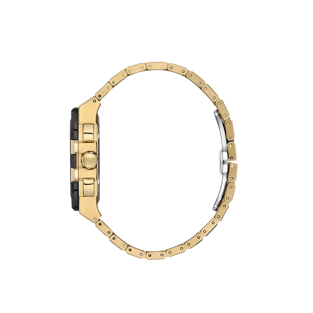 Carcasa rotunda de 44 mm este realizata din otel inoxidabil si este completata de un cadran negru cu afisaj analogic si detalii aurii, conferind ceasului un contrast puternic si sofisticat. Bratara din otel inoxidabil auriu, cu sistem de inchidere tip fluture, asigura un confort optim si o fixare sigura pe incheietura.