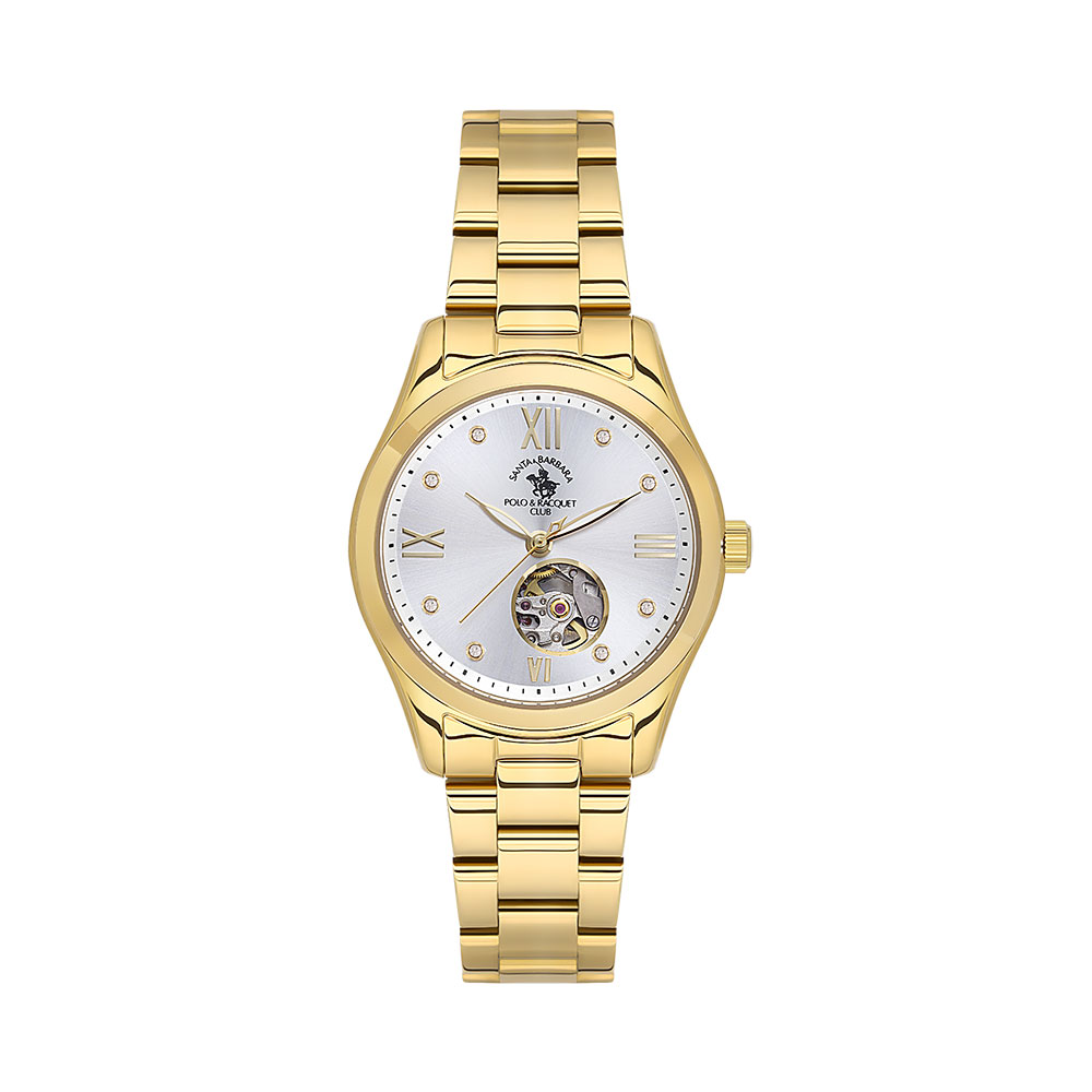Designul sau elegant este evidentiat de carcasa rotunda aurie din otel inoxidabil, completata armonios de bratara din acelasi material si culoare. Cadranul argintiu cu marcaje romane si detalii fine confera un aer clasic, in timp ce deschiderea tip skeleton ofera o privire subtila asupra mecanismului intern Miyota 6T28, un simbol al preciziei japoneze.