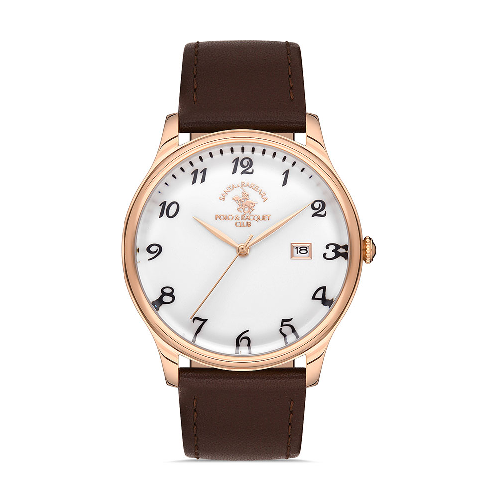 Cu o carcasa rotunda din otel inoxidabil in nuanta auriu rose, acest ceas emana rafinament si durabilitate. Cadranul alb cu cifre arabe negre ofera o lizibilitate excelenta, iar logo-ul Santa Barbara Polo & Racquet adauga un plus de distinctie.