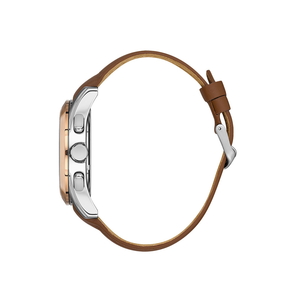 Cureaua din piele maro de inalta calitate adauga un plus de confort si durabilitate, fiind prevazuta cu un sistem de inchidere cu catarama clasica. Cu o rezistenta la apa de 5 ATM, acest ceas poate face fata stropilor de apa si ploii usoare.