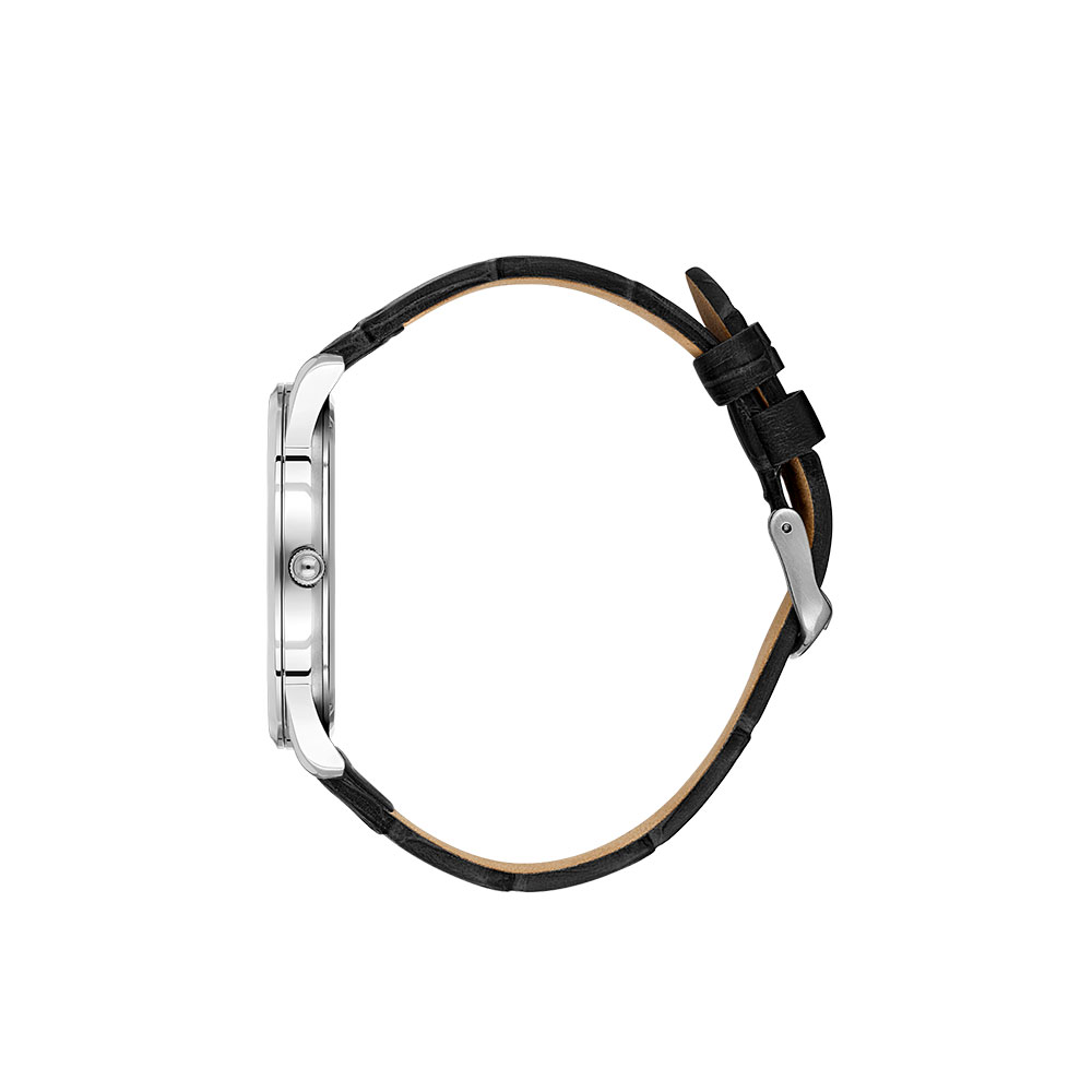 Carcasa rotunda din otel inoxidabil argintiu, cu un diametru de 41 mm si grosime de doar 7 mm, confera ceasului un profil subtire si sofisticat. Cadranul argintiu cu afisaj analogic este protejat de un geam din cristal mineral, rezistent la zgarieturi si socuri usoare. Indicii geometrici si limba minutara fina accentueaza estetica moderna a ceasului.