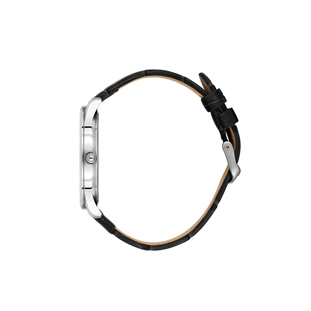 Carcasa rotunda din otel inoxidabil argintiu, cu diametru de 41 mm si grosime de doar 7 mm, confera un profil subtire si confortabil pe incheietura. Cadranul negru este completat de indicatoare argintii in forma de sageata si o fereastra de afisare a datei pozitionata discret la ora 3.