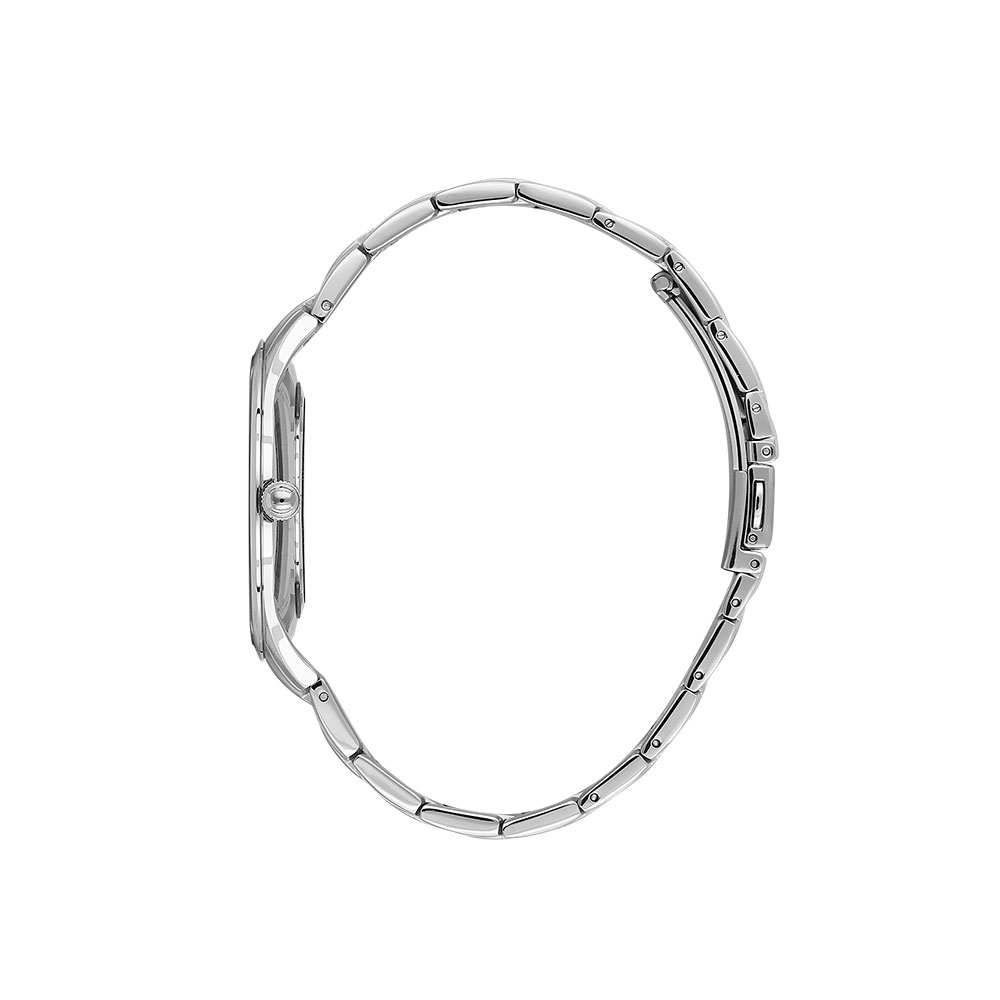 Carcasa rotunda si bratara sunt realizate din otel inoxidabil argintiu, oferind un aspect lucios si rezistenta sporita in timp. Cadranul argintiu, cu afisaj analogic curat si indexuri fine, este protejat de un geam din cristal safir, recunoscut pentru durabilitatea si rezistenta sa la zgarieturi.