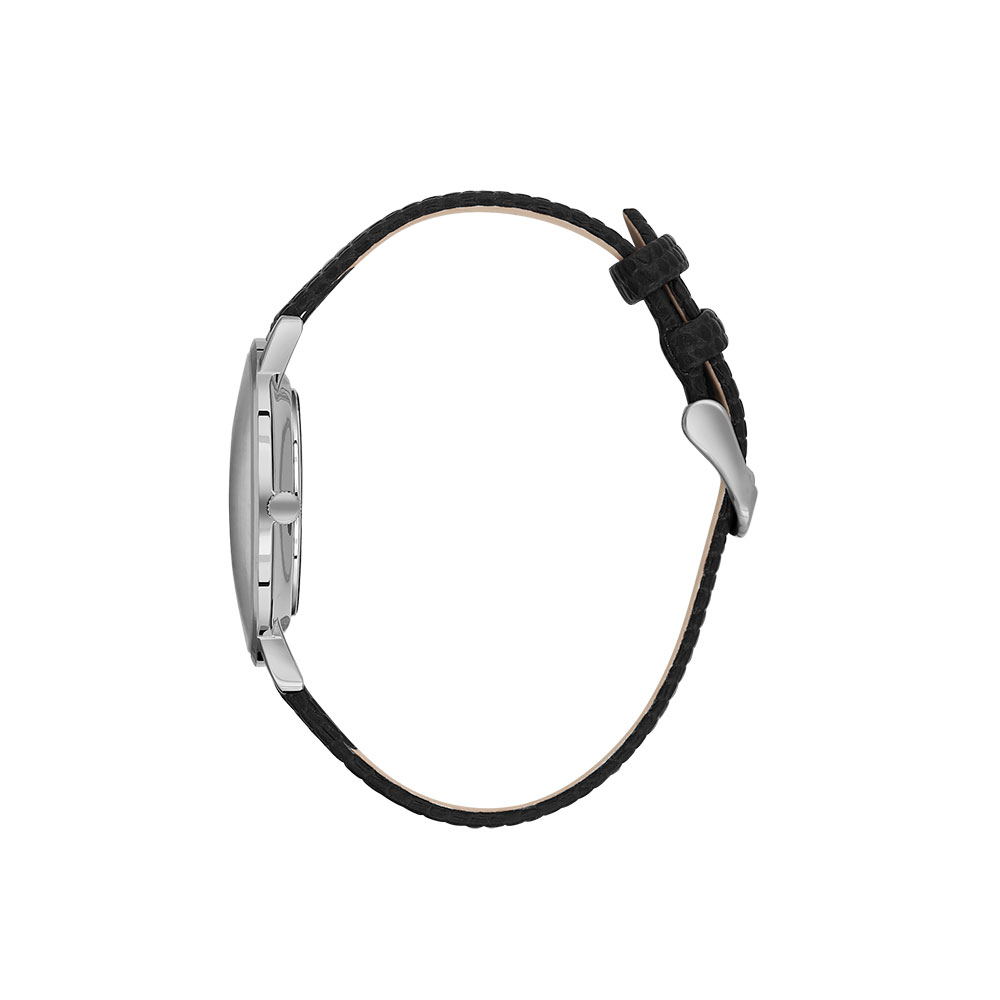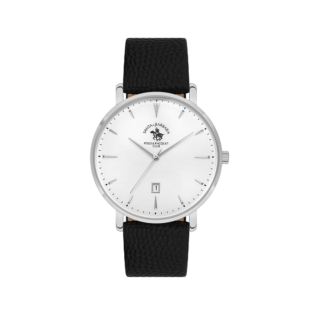 Carcasa rotunda din otel inoxidabil argintiu, cu un diametru de 40 mm si o grosime de doar 9 mm, ofera un profil subtire si confortabil la purtare. Cadranul alb cu afisaj analogic este protejat de un geam din cristal mineral, rezistent la zgarieturi si socuri minore. Indicii metalici subtiri si logoul distinctiv Santa Barbara Polo & Racquet Club completeaza estetica sofisticata.