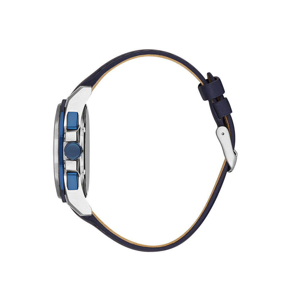 Cureaua din piele bleumarin, cu o latime de 21 mm si o lungime de 205 mm, completeaza perfect designul sofisticat, oferind confort pe durata intregii zile. Sistemul de inchidere cu catarama garanteaza o fixare sigura si ajustabila.