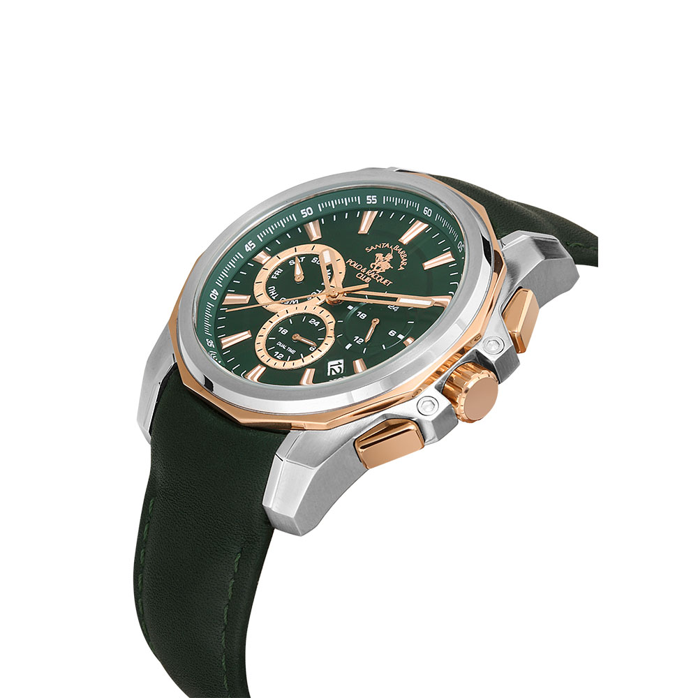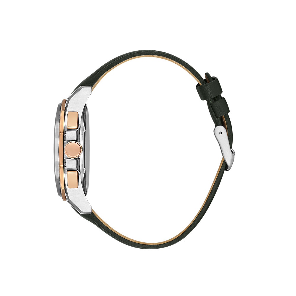 Cureaua din piele verde, cu sistem de inchidere tip catarama, ofera confort sporit si un plus de stil. Rezistenta la apa de 5 ATM il face potrivit pentru utilizarea zilnica, protejandu-l impotriva stropilor si a ploii.