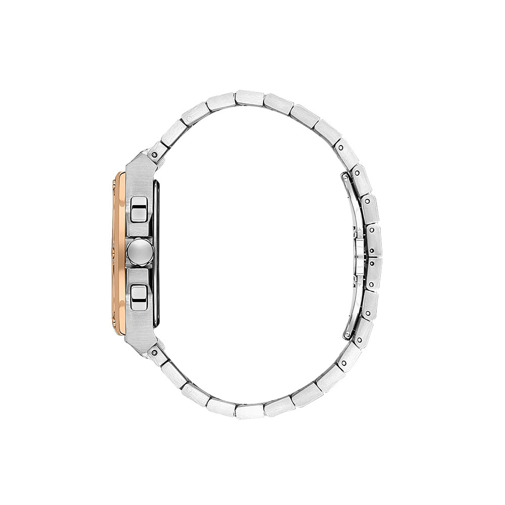 Carcasa dreptunghiulara din otel inoxidabil are un finisaj bicolor, combinand argintiul cu accente de auriu rose, ceea ce confera un aspect distinct si modern. Cadranul cafeniu este protejat de un geam din cristal mineral, asigurand durabilitate si claritate optima.