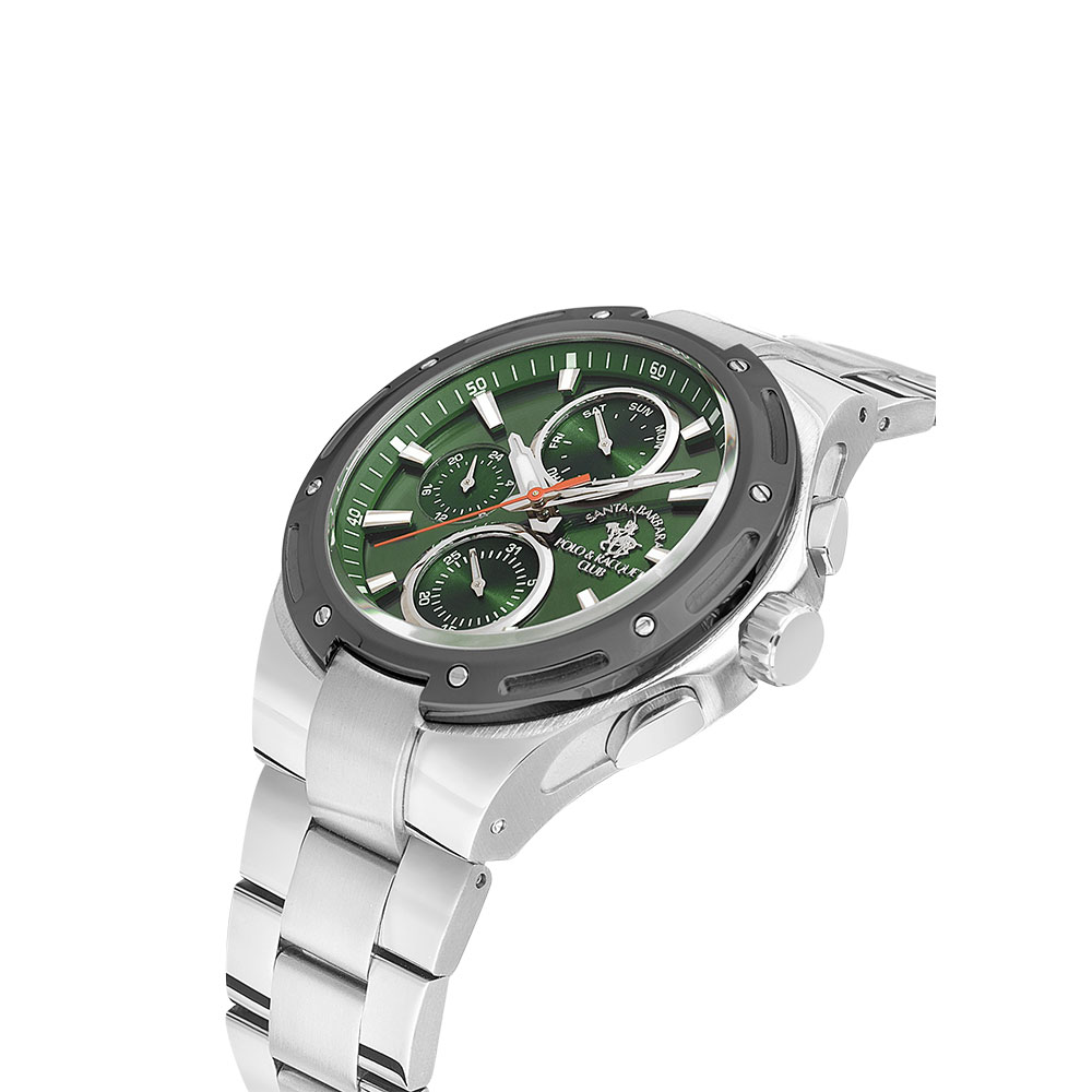 Carcasa rotunda din otel inoxidabil argintiu, cu dimensiunea generoasa de 45 mm, gazduieste un cadran analogic verde elegant, protejat de un geam din cristal mineral rezistent la zgarieturi. Cu o grosime de 14 mm, ceasul are o prezenta robusta, ideala pentru barbatul modern, activ si preocupat de imaginea sa.