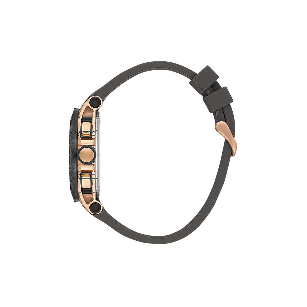 Carcasa rotunda din otel inoxidabil, cu un diametru de 45 mm si grosime de 13 mm, asigura rezistenta si durabilitate in timp. Geamul este realizat din cristal mineral, protejand eficient mecanismul impotriva zgarieturilor si socurilor. Bratara din silicon gri cu inchidere tip catarama adauga un plus de confort si flexibilitate, perfecta pentru activitatile zilnice sau sportive.