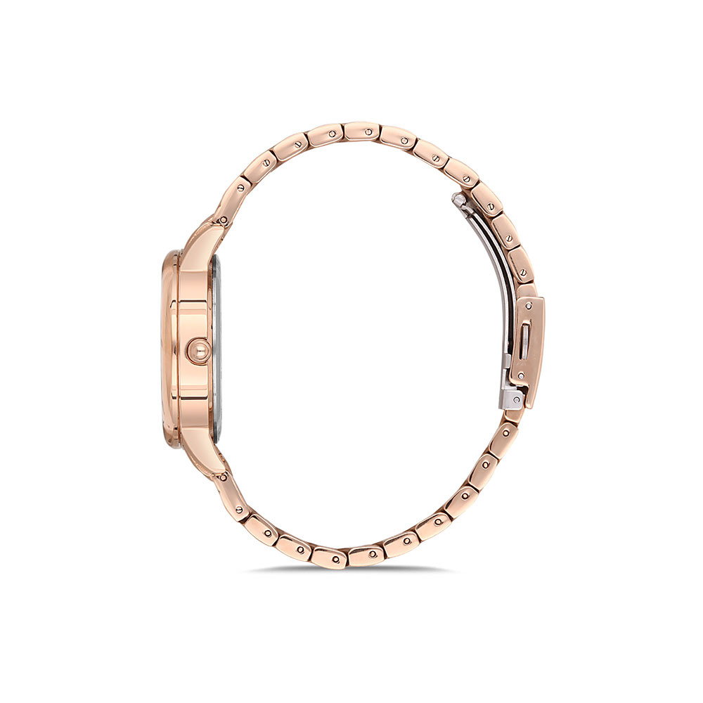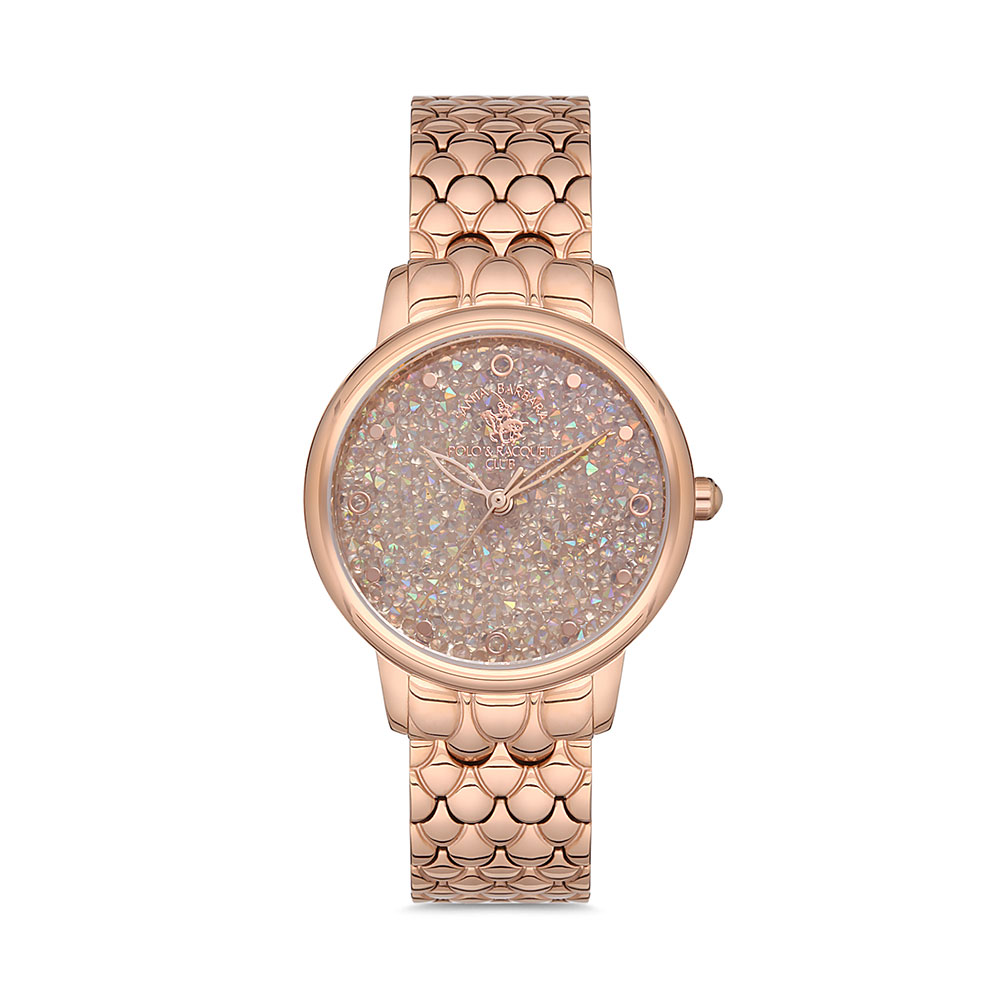 Cadranul rotund, cu un diametru de 34 mm, impresioneaza prin fundalul sau stralucitor, decorat cu cristale fine, care reflecta lumina in mod spectaculos. Carcasa din alama, in nuanta auriu rose, completeaza perfect estetica sofisticata a ceasului.