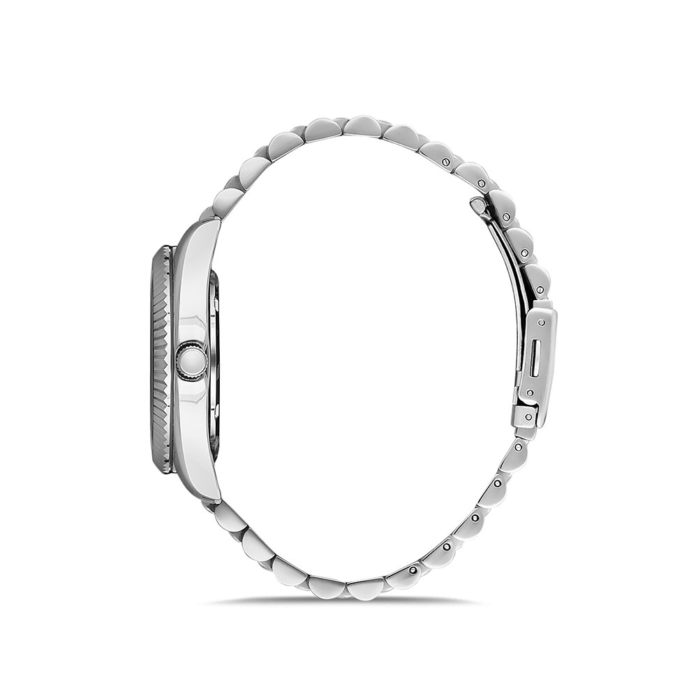 Cadran decorat cu zirconii albe; indicatoare luminoase; bratara tip zale, in doua tonuri, argintiu mat si lucios, cu inchizatoare tip fluture, avand o lungime utila de 19 cm; afiseaza data si ziua curente si ora in format 12/24.