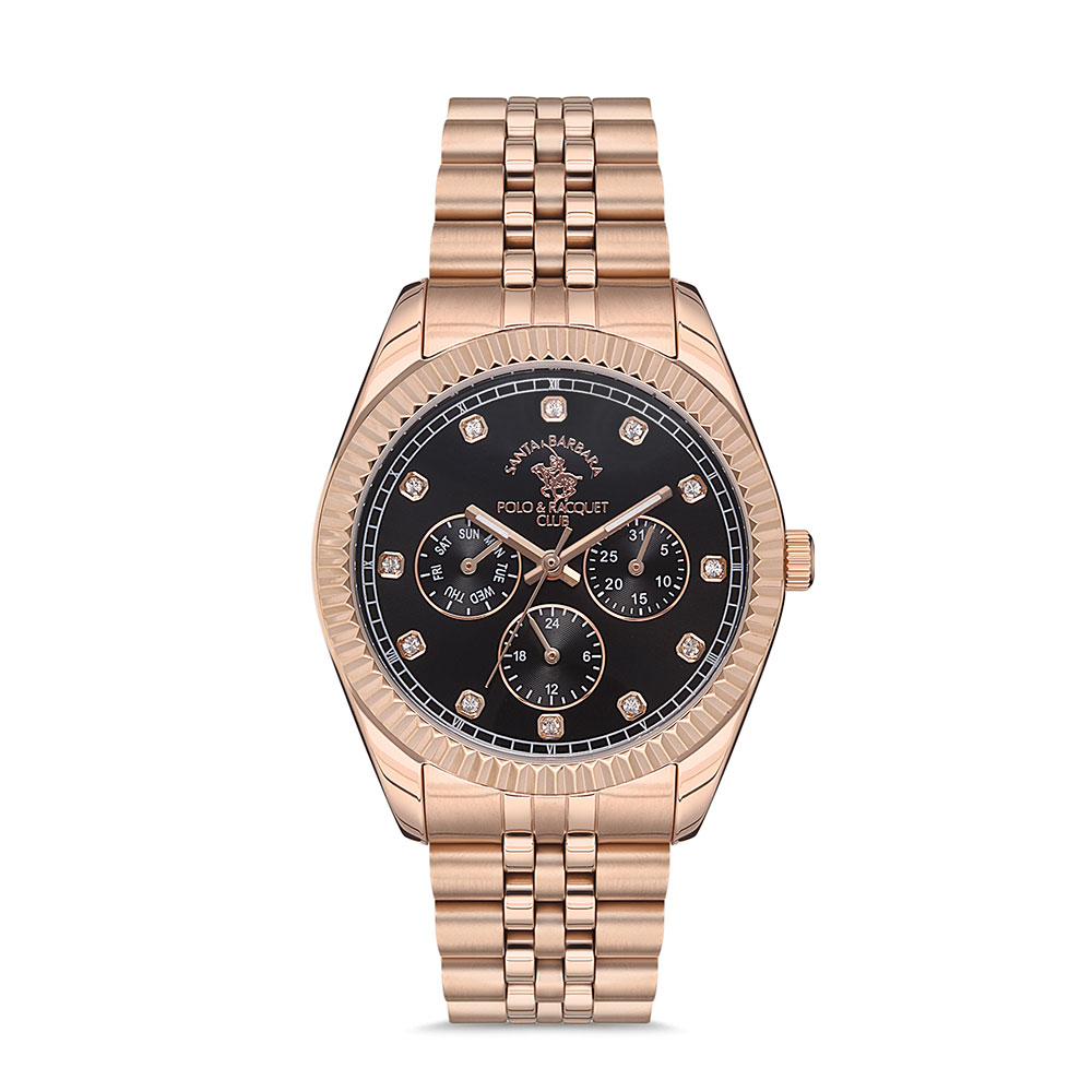 Cadranul negru este decorat cu cristale stralucitoare ce inlocuiesc indicii orari, oferind un efect de lux subtil. Cele trei subcadrane functionale afiseaza ora in format 12/24, ziua saptamanii si data, asigurand un plus de utilitate in viata de zi cu zi.