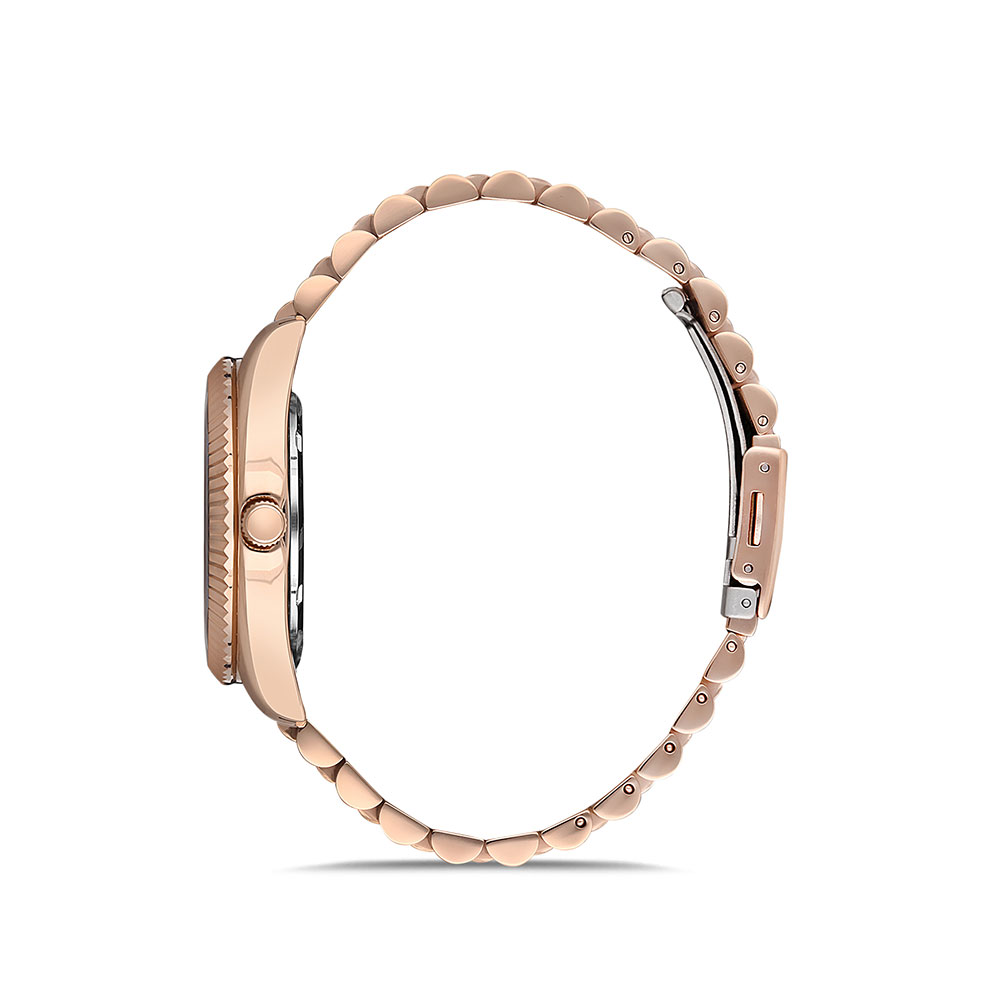 Carcasa rotunda din aliaj metalic, cu diametrul de 38 mm si grosimea de 12 mm, este completata de o bratara eleganta din otel inoxidabil auriu rose, care confera durabilitate si confort la purtare. Sistemul de inchidere tip fluture asigura o fixare sigura si comoda.