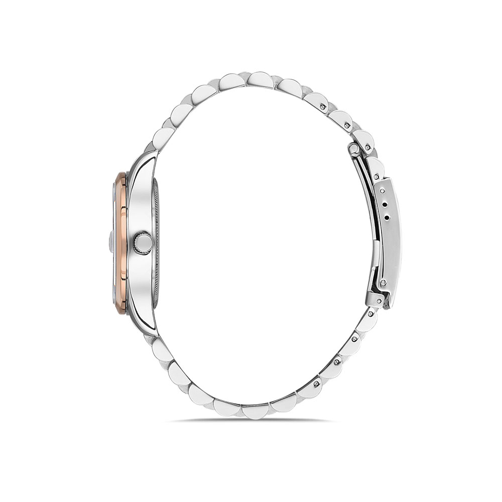 Indicatoare luminoase; carcasa argintie cu bezel decorativ auriu rose; bratara tip zale, in doua culori, argintiu si auriu rose, cu inchizatoare tip fluture, avand o lungime utila de 18 cm; afiseaza data curenta.
