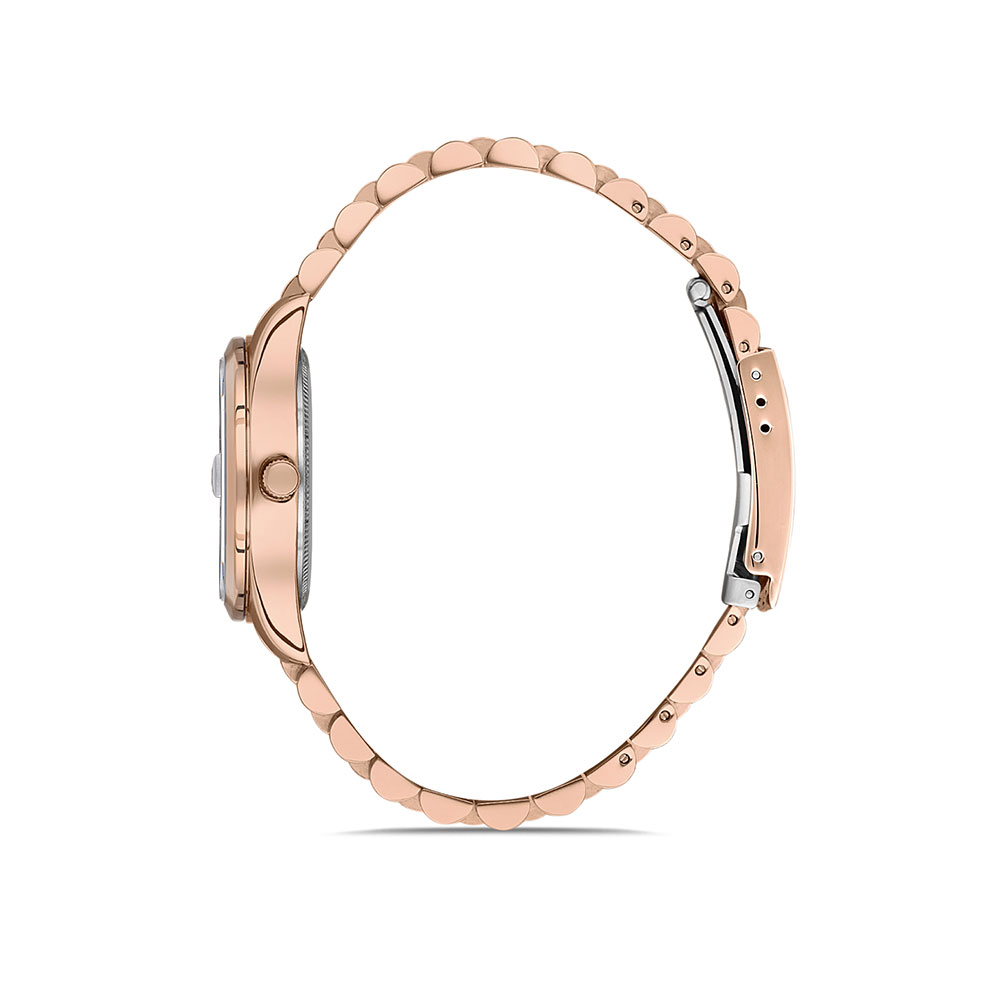 Bratara din otel inoxidabil, in aceeasi nuanta sofisticata de auriu rose, este prevazuta cu un sistem de inchidere tip fluture, asigurand confort si siguranta la purtare. Rezistenta la apa de 5 ATM face ca acest ceas sa fie potrivit pentru utilizarea zilnica, protejandu-l impotriva stropilor de apa.
