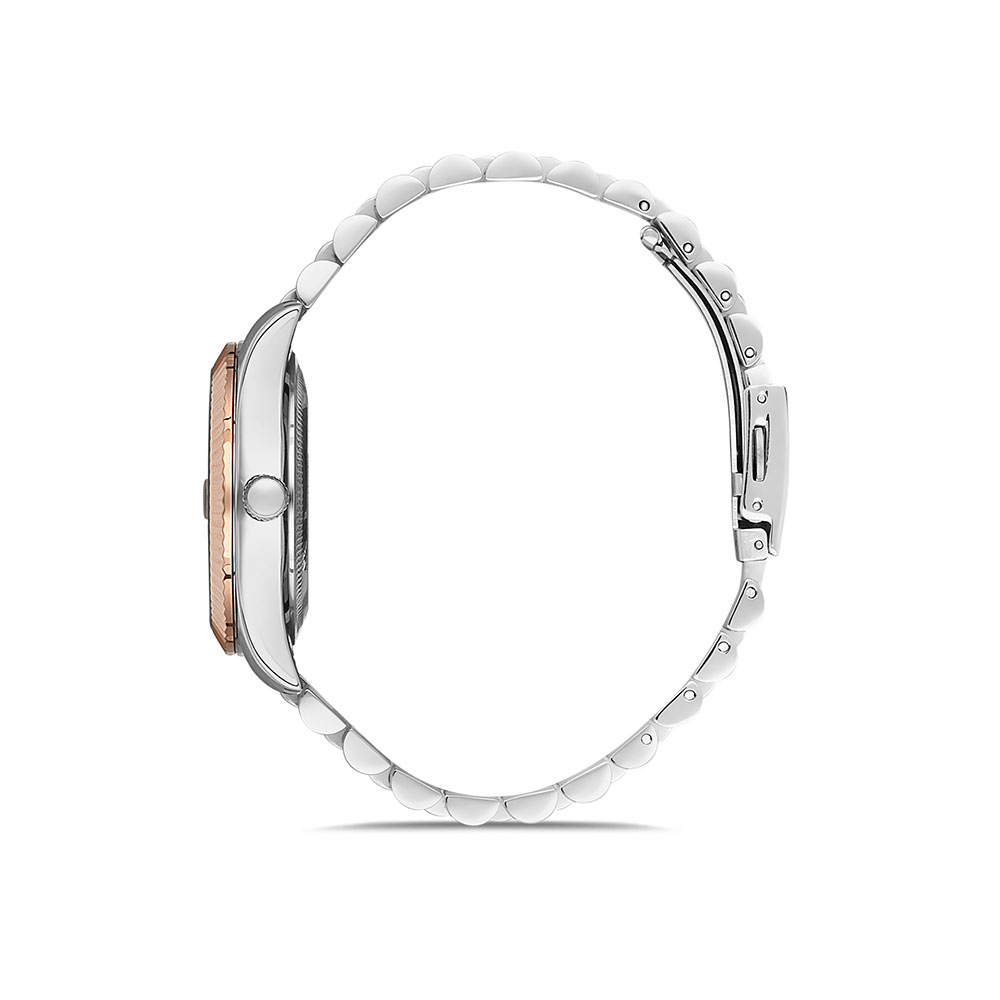 Indicatoare luminoase; geam cu lupa in dreptul datei; carcasa argintie cu bezel decorativ auriu rose; bratara tip zale, in doua culori, argintiu si auriu rose, cu inchizatoare tip fluture; afiseaza data si ziua curente.
