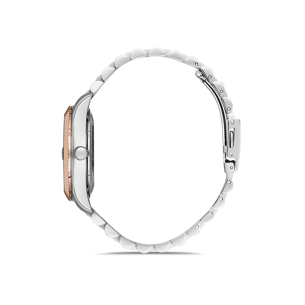 Indicatoare luminoase; geam cu lupa in dreptul datei; carcasa argintie cu bezel decorativ auriu rose; bratara tip zale, in doua culori, argintiu si auriu rose, cu inchizatoare tip fluture; afiseaza data si ziua curente.