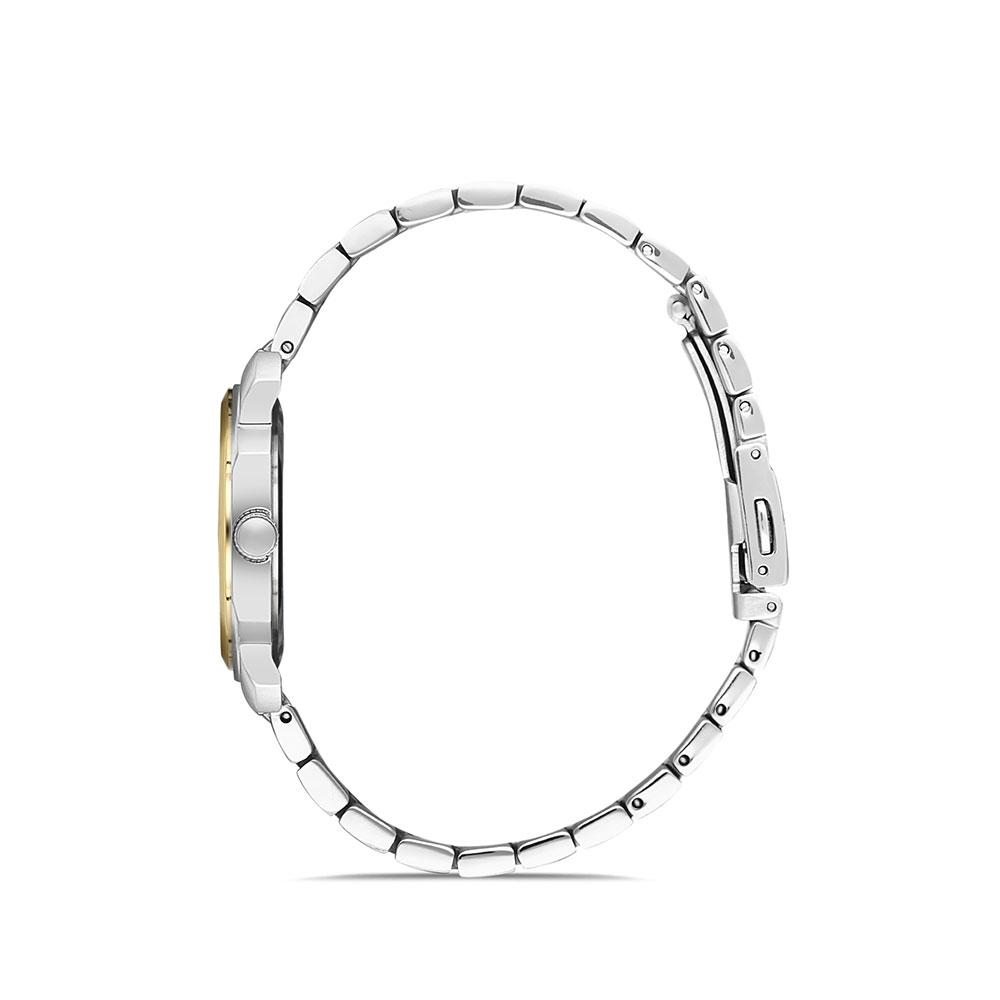 Carcasa octogonala din otel inoxidabil argintiu cu accente aurii adauga un plus de stil, in timp ce bratara bicolora (argintiu si auriu) ofera un echilibru perfect intre clasic si modern. Sistemul de inchidere tip fluture asigura confort si siguranta la purtare.