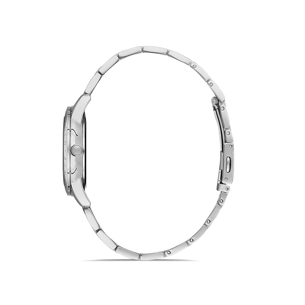 Cadran alb sidefat, decorat cu zirconii albe; bratara tip zale, cu inchizatoare tip fluture.