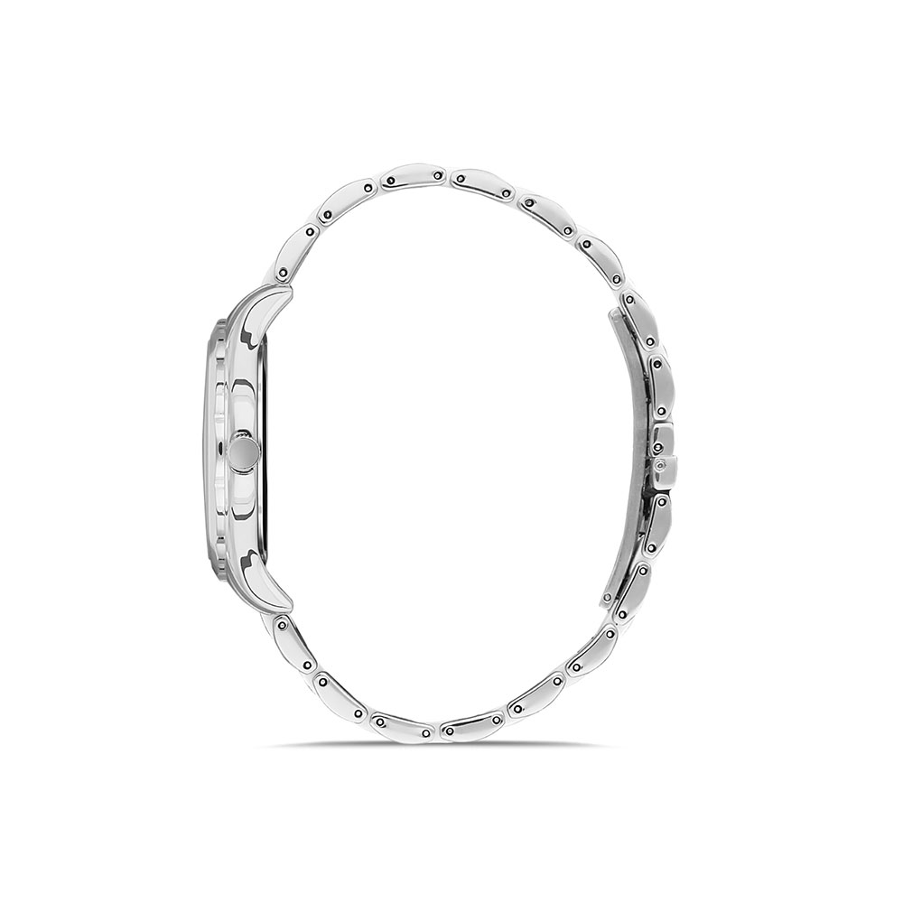 Bratara din otel inoxidabil in nuante de argintiu si alb adauga un contrast rafinat si se fixeaza cu un sistem de inchidere fluture, asigurand confort si siguranta pe durata purtarii.