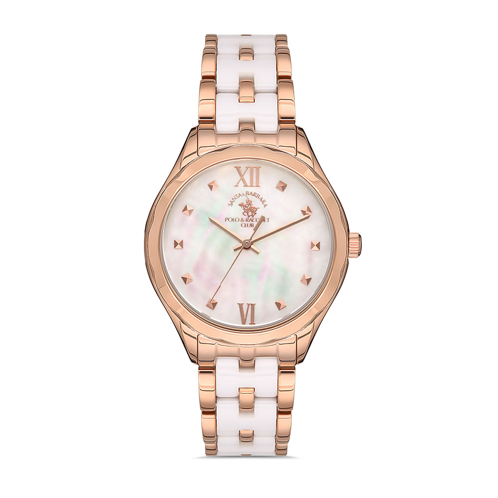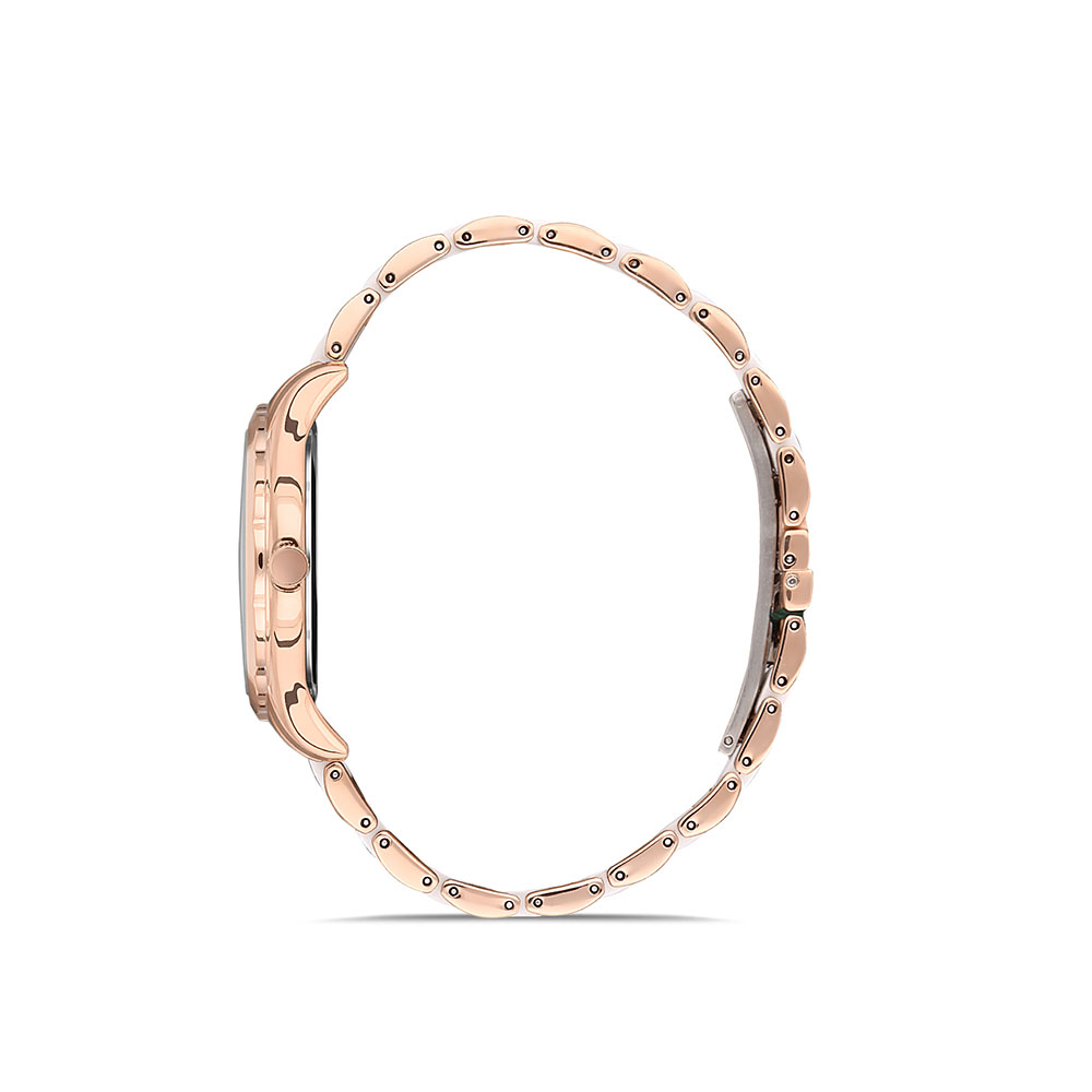 Cu o carcasa rotunda din aliaj metalic de culoare auriu rose si un cadran din sidef, acest ceas emana lux si stil. Marcajele orare in relief si indicatoarele subtiri adauga un plus de eleganta, in timp ce mecanismul quartz japonez asigura precizie si fiabilitate.