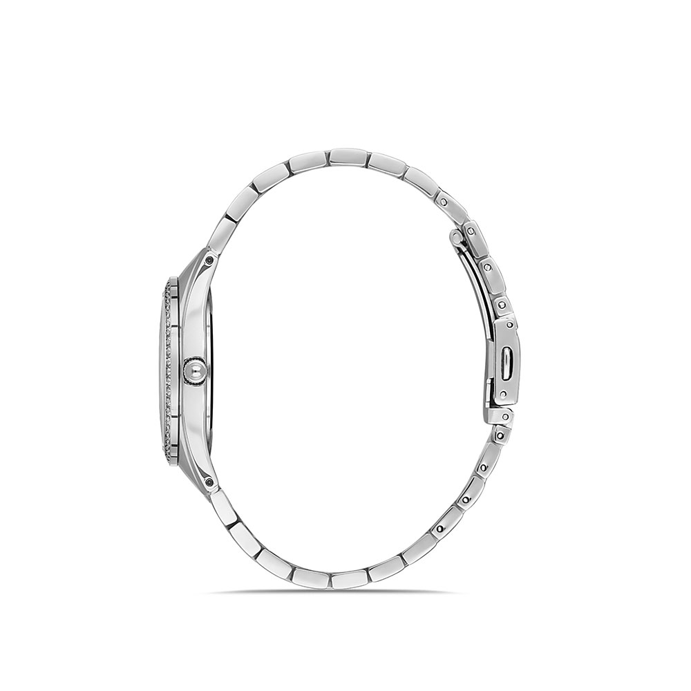 Cadran partial sidefat, decorat cu zirconii albe; carcasa decorata cu zirconii albe; bratara tip zale, cu inchizatoare tip fluture.