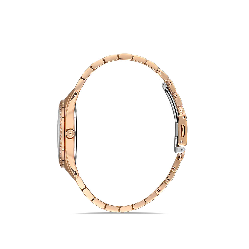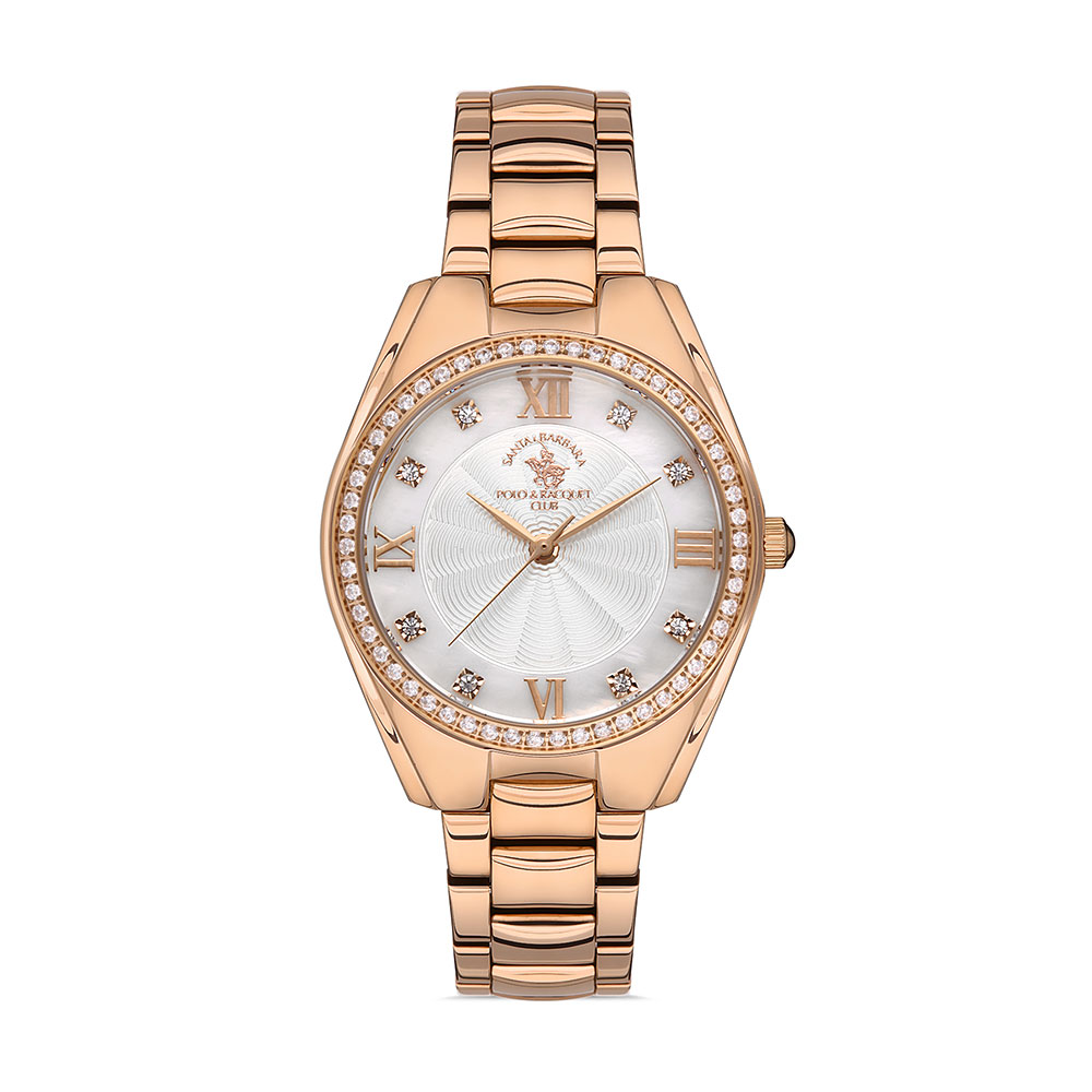 Carcasa rotunda din alama auriu rose de 34 mm confera un aer luxos, in timp ce cadranul din sidef este decorat cu marcaje romane si cristale stralucitoare, oferind un efect vizual deosebit. Geamul din cristal mineral asigura protectie impotriva zgarieturilor, pastrand aspectul impecabil al ceasului.