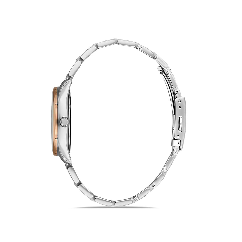 Carcasa argintie, cu bezel decorativ auriu rose; bratara tip zale, in doua culori, argintiu si auriu rose, cu inchizatoare tip fluture