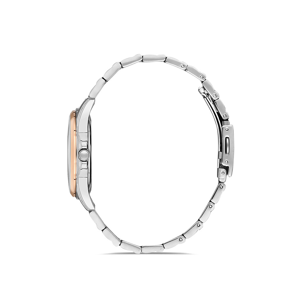 Cu o carcasa rotunda de 34 mm din otel inoxidabil argintiu si un cadran alb-argintiu cu un finisaj texturat subtil, acest ceas atrage privirile prin detaliile sale fine. Accentele aurii rose de pe bezel si marcajele orare completeaza armonios aspectul luxos al ceasului.