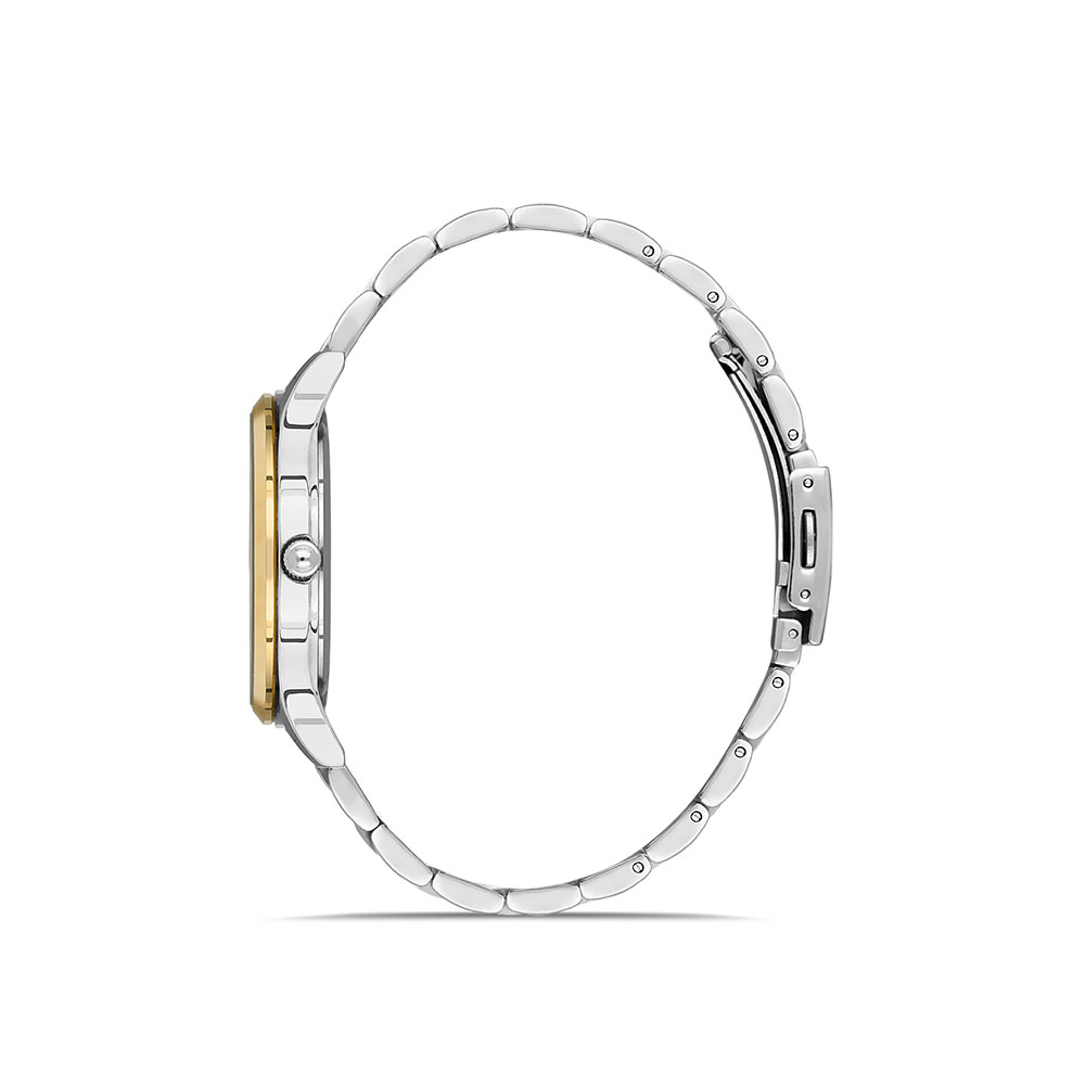 Cadran partial sidefat; carcasa argintie, cu bezel decorativ auriu; bratara tip zale, in doua culori, argintiu si auriu, cu inchizatoare tip fluture.