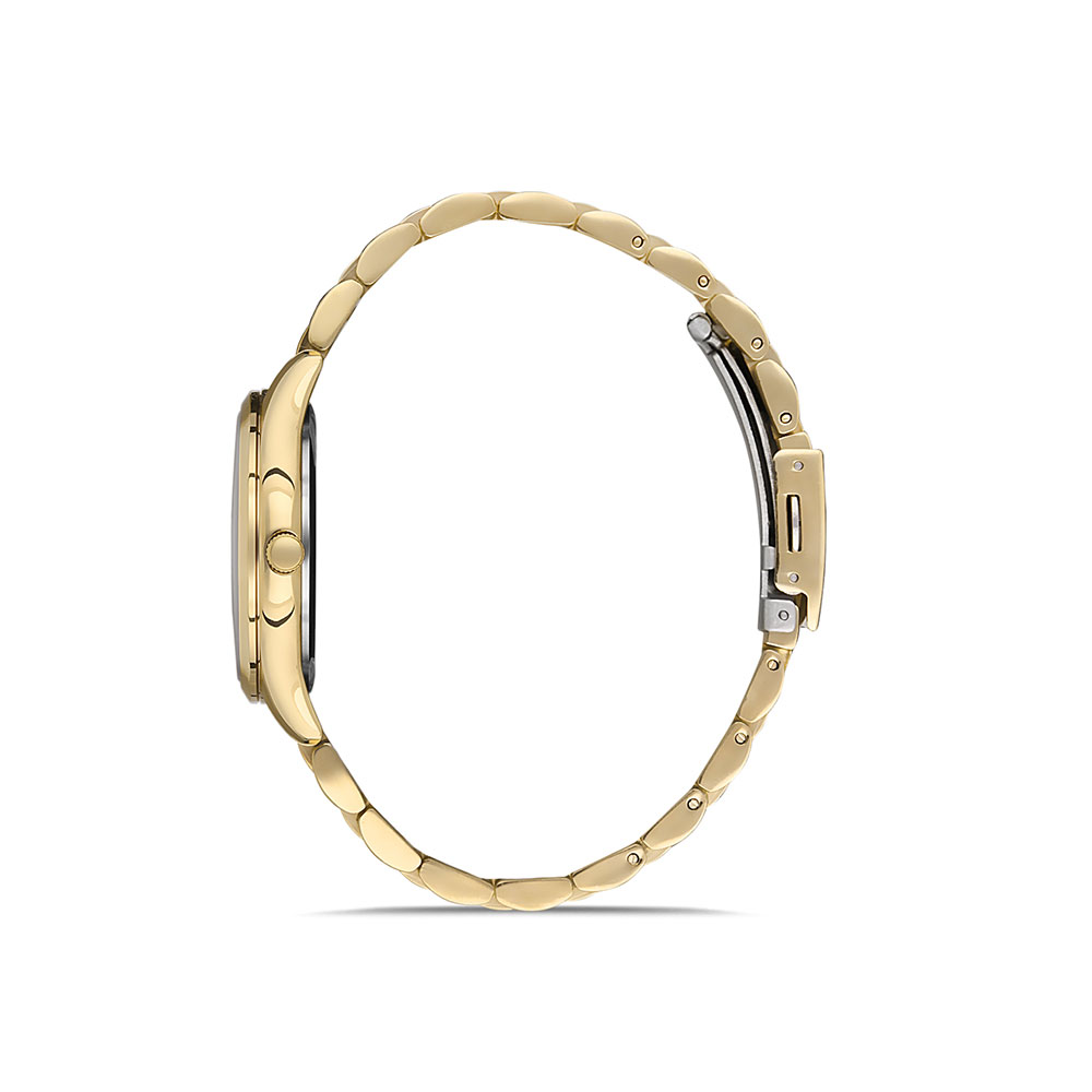 Cadran alb sidefat, decorat cu zirconii albe; bratara tip zale, cu inchizatoare tip fluture.
