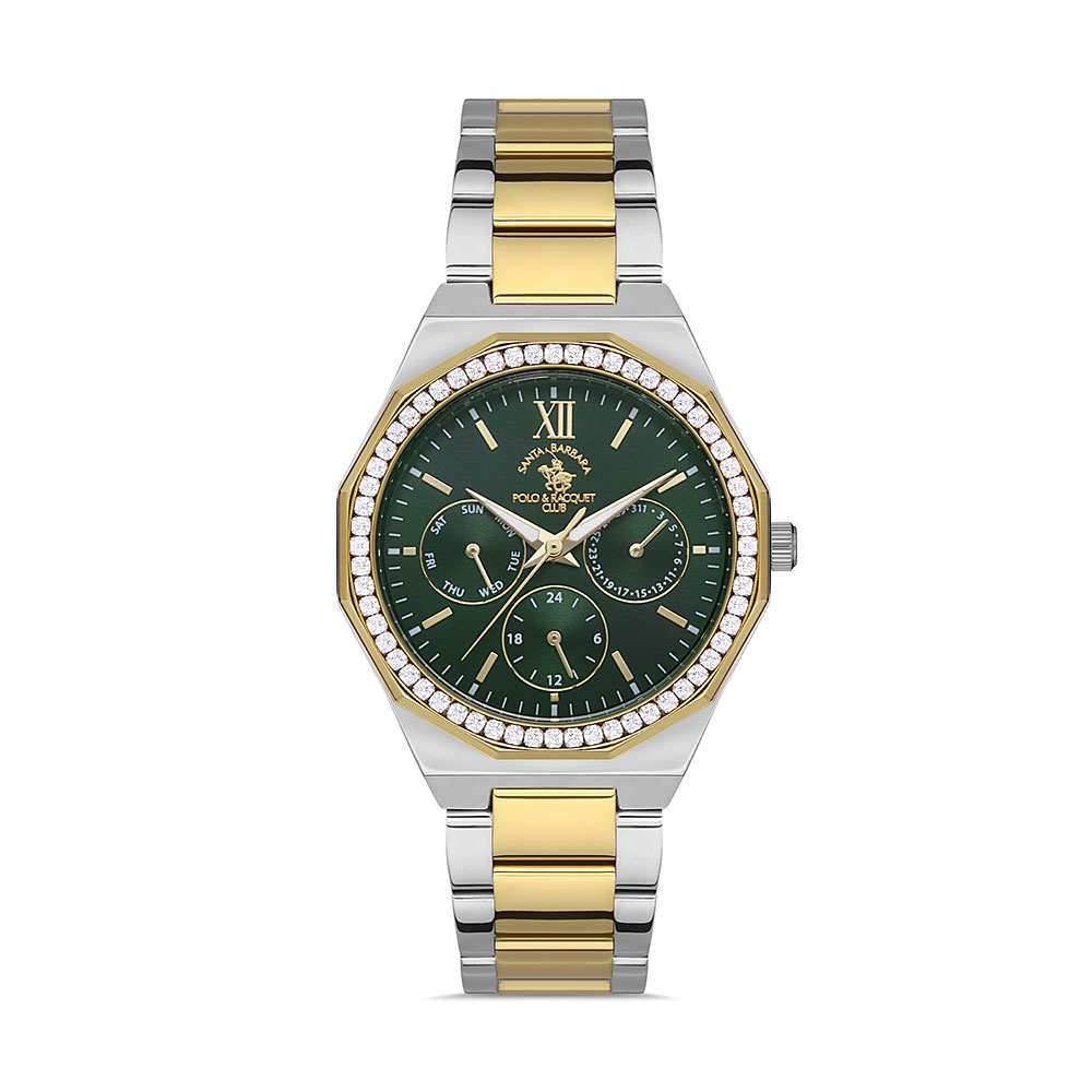 Ceasul de dama cu bratara din otel inoxidabil argintiu si auriu este un accesoriu elegant si rafinat. Bratara din otel inoxidabil combina nuante argintii si aurii, creand un aspect stralucitor si sofisticat. Aceasta combinatie de culori face ca ceasul sa se potriveasca cu o gama larga de tinute si stiluri. br> Cadranul ceasului are un design distinctiv, cu un interior verde, ceea ce adauga un element de prospetime si originalitate. Verdele este o culoare vibranta, care poate oferi o nota de culoare si stil oricarei tinute. br>Ceasurile Santa Barbara Polo&Racquet Club continua traditia celui mai vechi si prestigios club de polo din SUA. Combinand cu succes un design elegant si materiale de calitate, ceasurile Santa Barbara Polo&Racquet Club sunt un accesoriu care va completa cu succes o tinuta office sau casual. br>Fotografiile produselor au rol de prezentare. Intre imaginile afisate pe site si produsele achizitionate pot aparea mici diferente de culori.