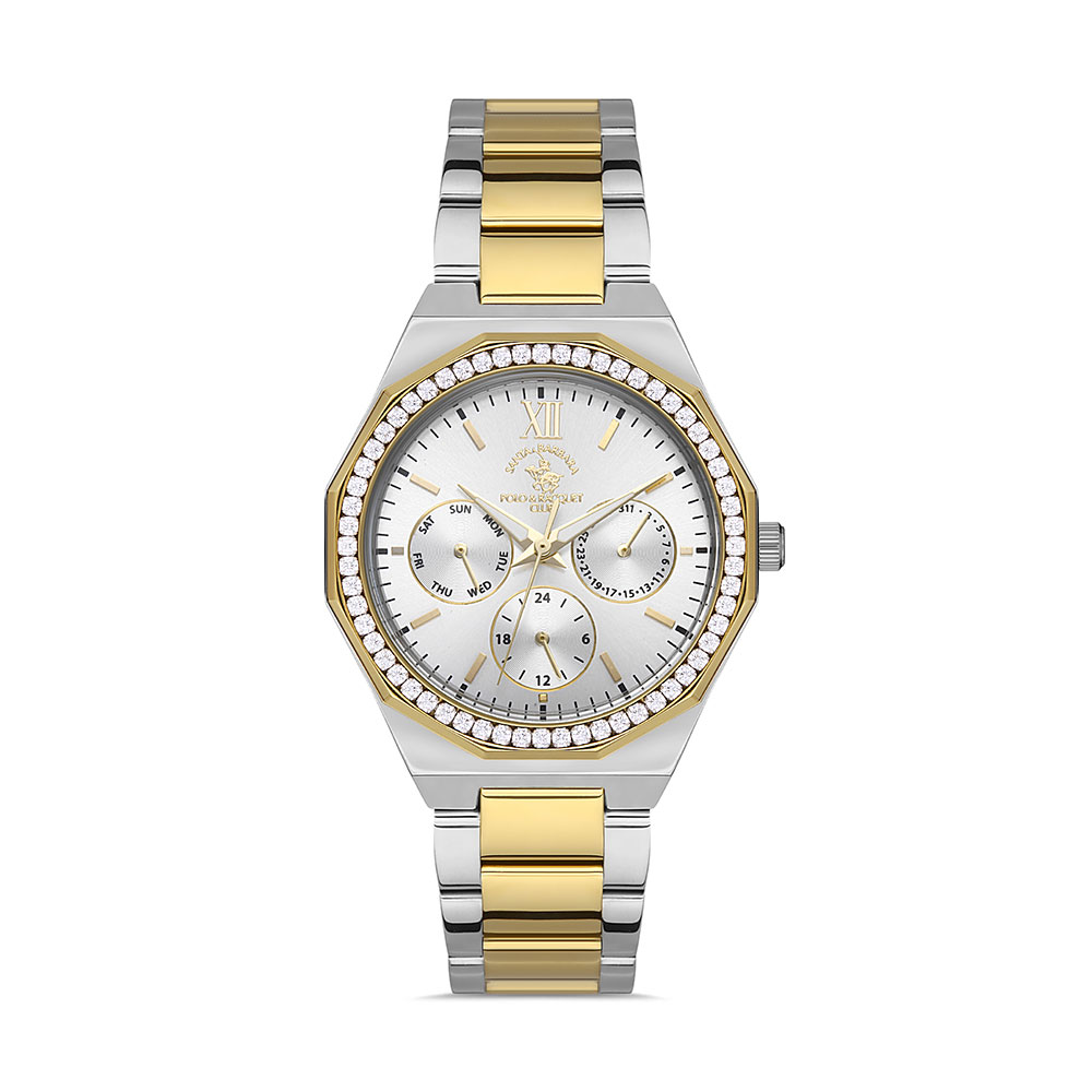 Ceasul de dama cu bratara din otel inoxidabil argintiu cu auriu mat, este un accesoriu elegant si sofisticat, perfect pentru a-ti completa tinuta la orice ocazie. Fiecare detaliu al acestui ceas a fost atent proiectat pentru a aduce un plus de rafinament si stralucire in aspectul sau. br> In jurul cadranului se regasesc zirconii stralucitoare, care adauga un element de stralucire si glamour ceasului. Acestea sunt aranjate intr-un mod frumos si subtil, oferindu-i ceasului un aspect luxos si atragator. br>Ceasurile Santa Barbara Polo&Racquet Club continua traditia celui mai vechi si prestigios club de polo din SUA. Combinand cu succes un design elegant si materiale de calitate, ceasurile Santa Barbara Polo&Racquet Club sunt un accesoriu care va completa cu succes o tinuta office sau casual. br>Fotografiile produselor au rol de prezentare. Intre imaginile afisate pe site si produsele achizitionate pot aparea mici diferente de culori.