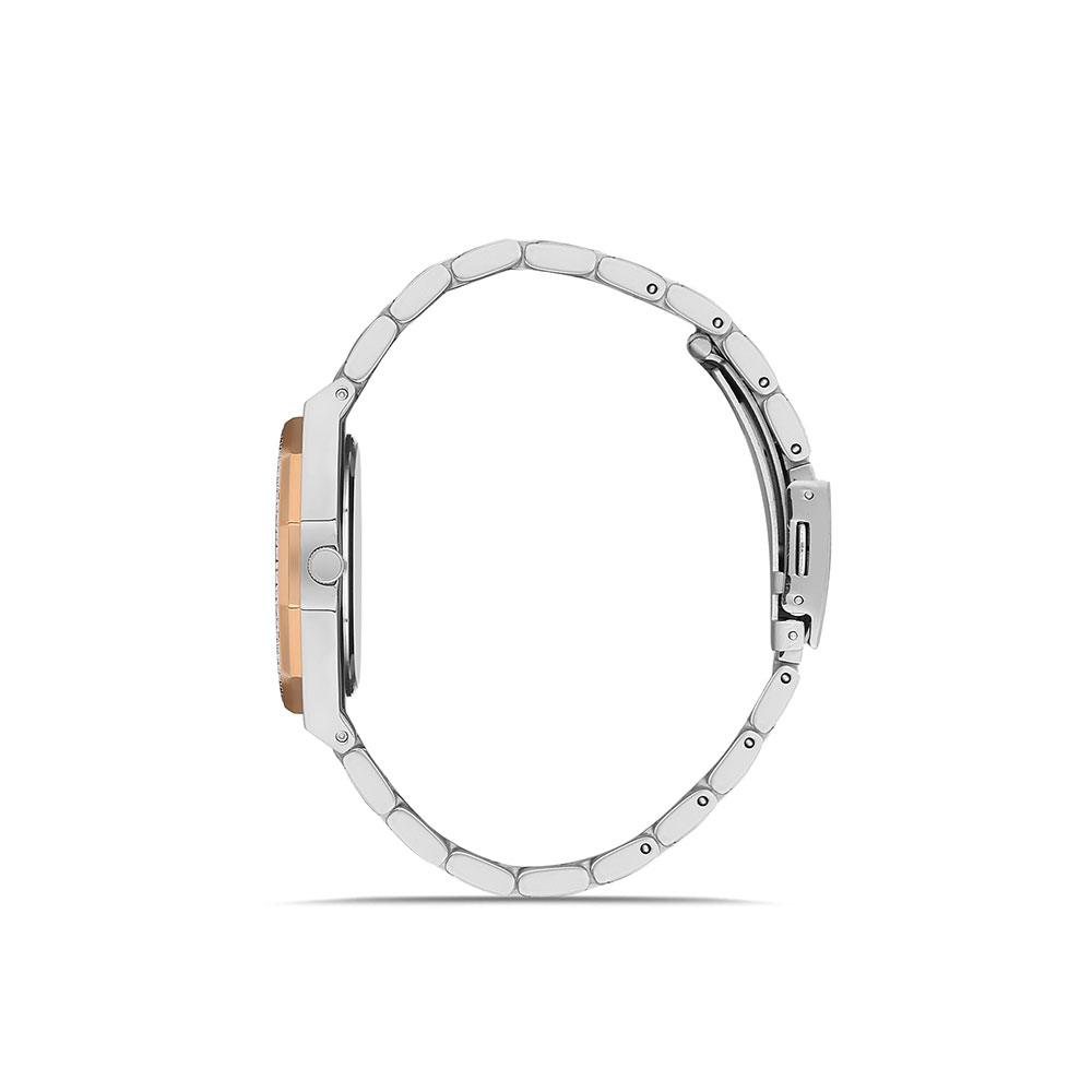 Cu o carcasa octogonala din otel inoxidabil argintiu, decorata cu cristale stralucitoare pe rama, acest ceas adauga un plus de stil oricarei tinute. Cadranul argintiu este completat de indicatoare si markeri in nuante de auriu rose, oferind un contrast elegant si usor de citit.