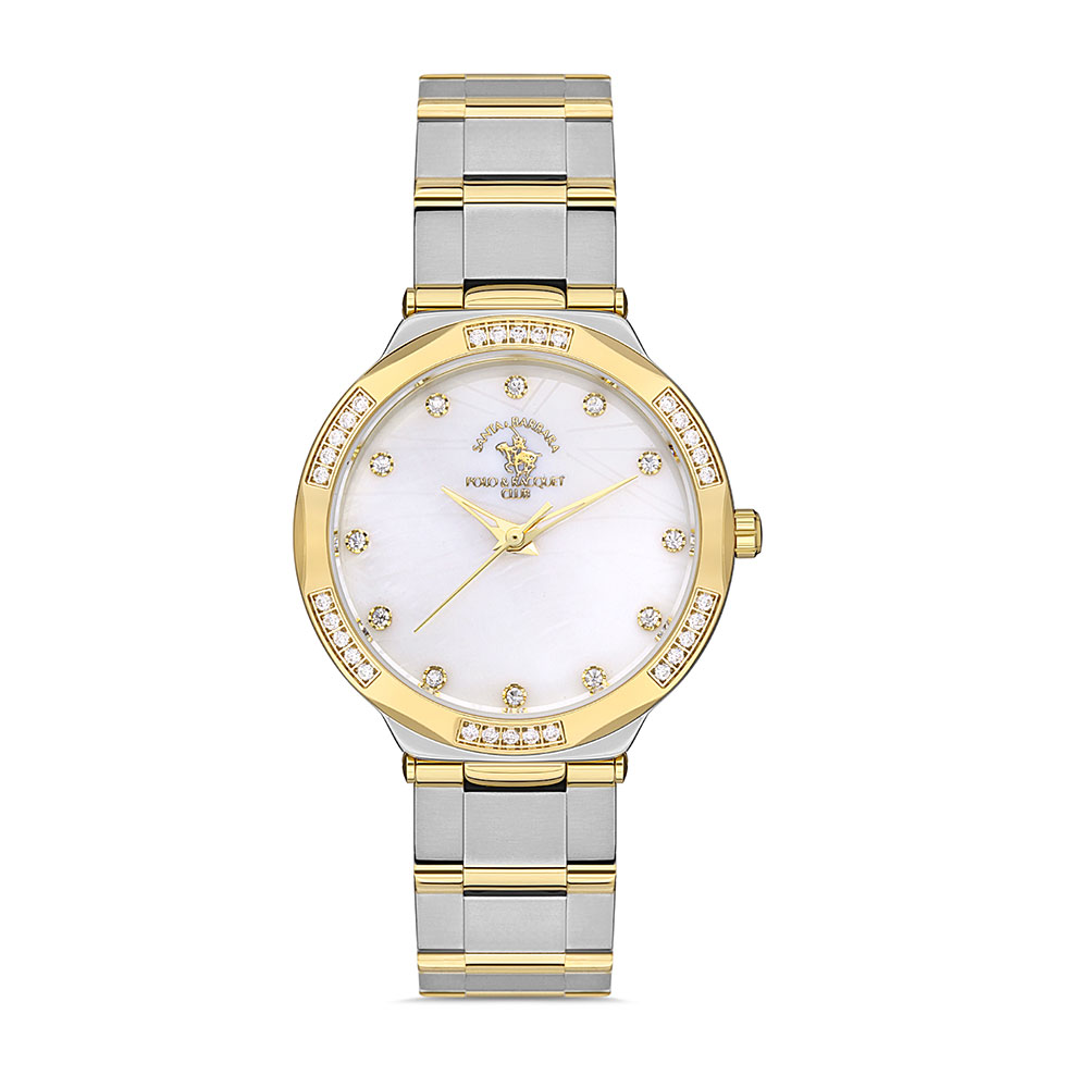 Ceas de dama cu sidef si zirconii stralucitoare. Bratara din otel inoxidabil este in doua culori, argintiu si auriu, iar in dreptul orelor sunt plasate zirconii stralucitoare. Un model elegant, pentru doamnele si domnisoarele atente la detalii.Ceasurile Santa Barbara Polo&Racquet Club continua traditia celui mai vechi si prestigios club de polo din SUA. Combinand cu succes un design elegant si materiale de calitate, ceasurile Santa Barbara Polo&Racquet Club sunt un accesoriu care va completa cu succes o tinuta office sau casual.Fotografiile produselor au rol de prezentare. Intre imaginile afisate pe site si produsele achizitionate pot aparea mici diferente de culori.