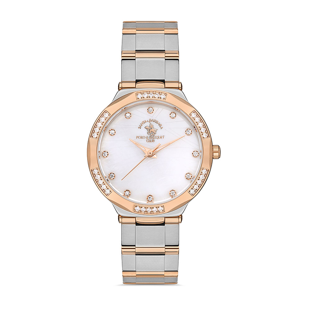 Ceasul de dama Santa Barbara Polo cu cadran decorat cu zirconii si sidef in interior, este un accesoriu elegant pentru doamnele cochete. Bratara de tip zale in doua culori se aseaza frumos pe orice incheietura si se asorteaza usor cu orice tinuta casual sau eleganta. Iesi in evidenta cu modelele Unique de la Santa barbara Polo.Ceasurile Santa Barbara Polo&Racquet Club continua traditia celui mai vechi si prestigios club de polo din SUA. Combinand cu succes un design elegant si materiale de calitate, ceasurile Santa Barbara Polo&Racquet Club sunt un accesoriu care va completa cu succes o tinuta office sau casual.Fotografiile produselor au rol de prezentare. Intre imaginile afisate pe site si produsele achizitionate pot aparea mici diferente de culori.