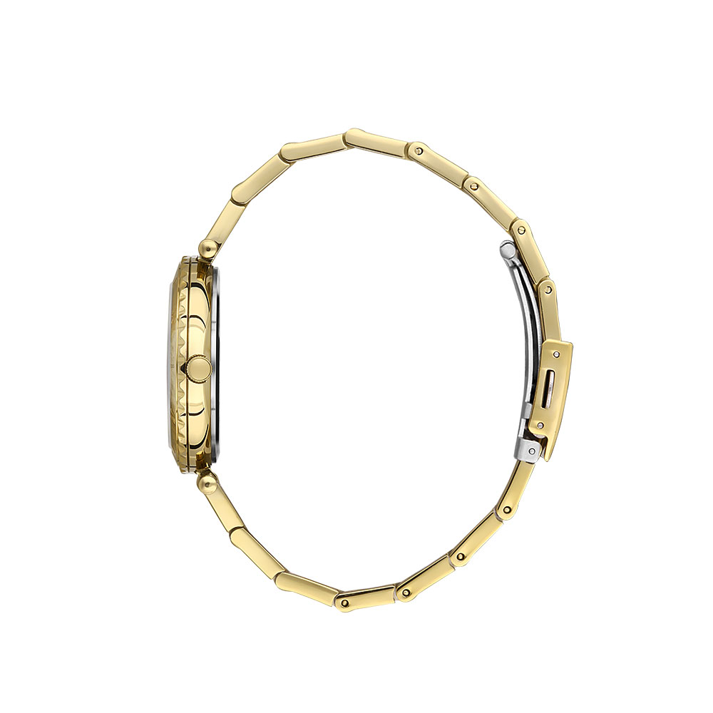 Bratara eleganta, confectionata din otel inoxidabil auriu, se inchide printr-un sistem de tip fluture, asigurand confort si siguranta la purtare. Mecanismul quartz japonez de inalta precizie garanteaza o functionare impecabila, cu o abatere de doar ±20 secunde pe luna.