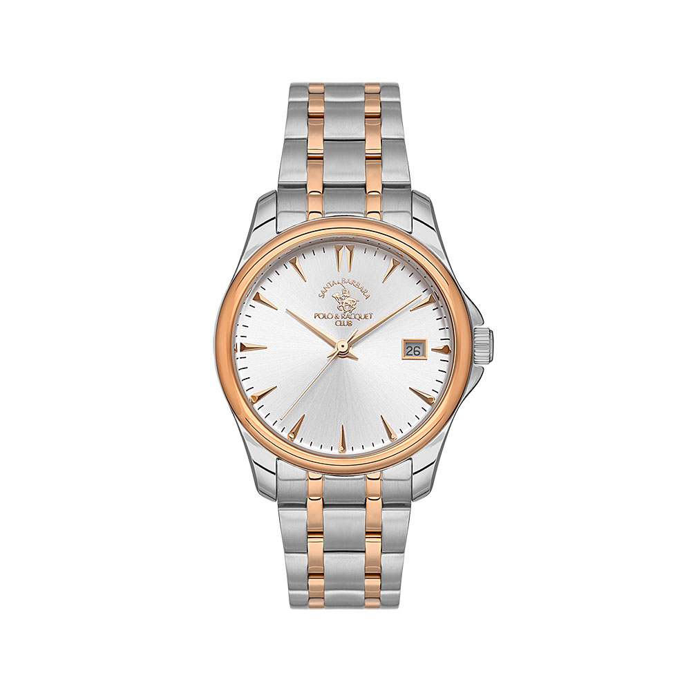Carcasa rotunda din alama, cu un diametru de 34 mm si o grosime de 10 mm, este completata de un cadran argintiu cu marcaje fine si logo-ul distinctiv Santa Barbara Polo & Racquet Club. Indicatorii si limbile aurii adauga un plus de eleganta, iar afisajul analogic ofera un aspect clasic si usor de citit.