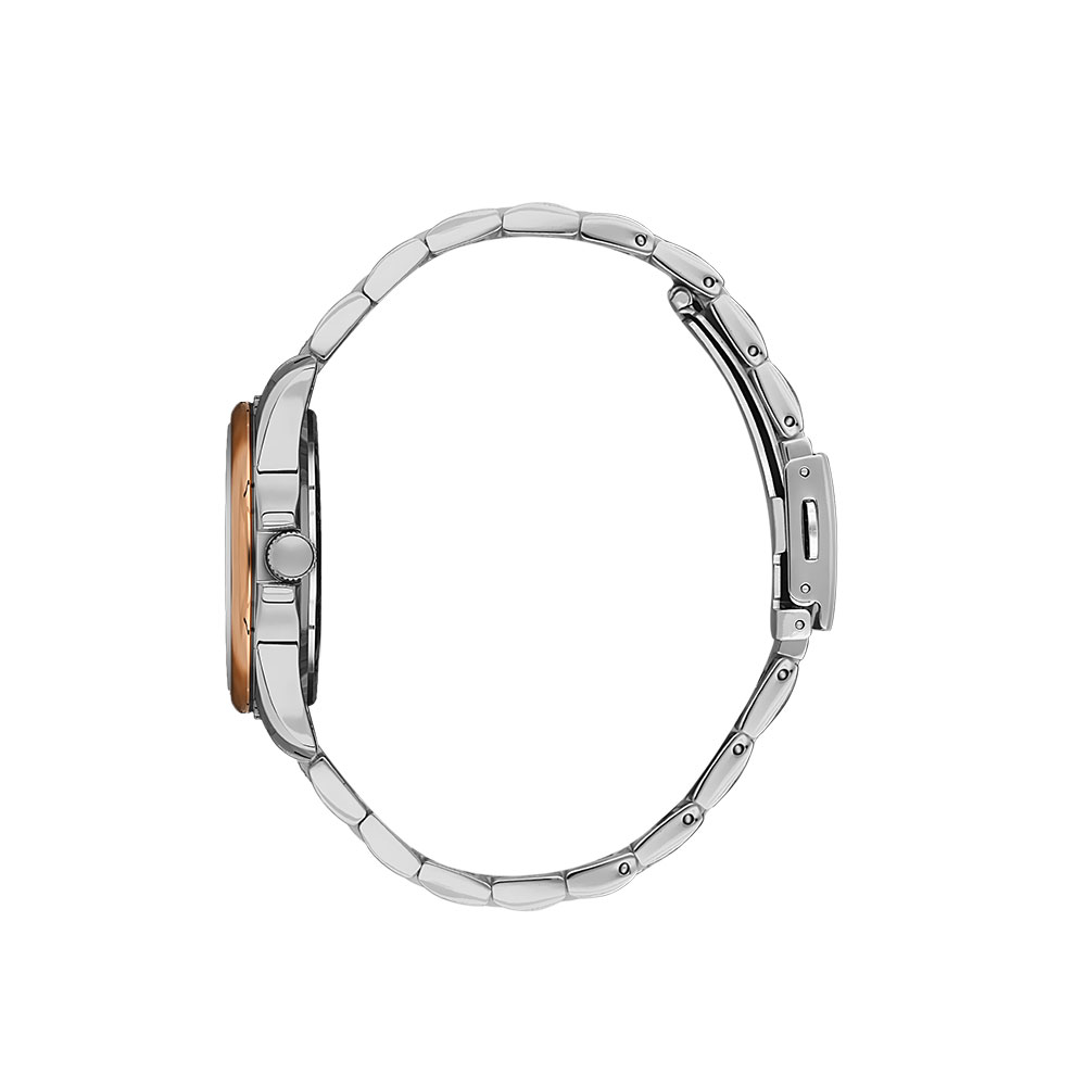 Bratara din otel inoxidabil, cu un design bicolor argintiu si auriu roz, confera un aer sofisticat si rezistenta sporita in timp. Sistemul de inchidere tip fluture asigura o fixare sigura si confortabila pe incheietura.